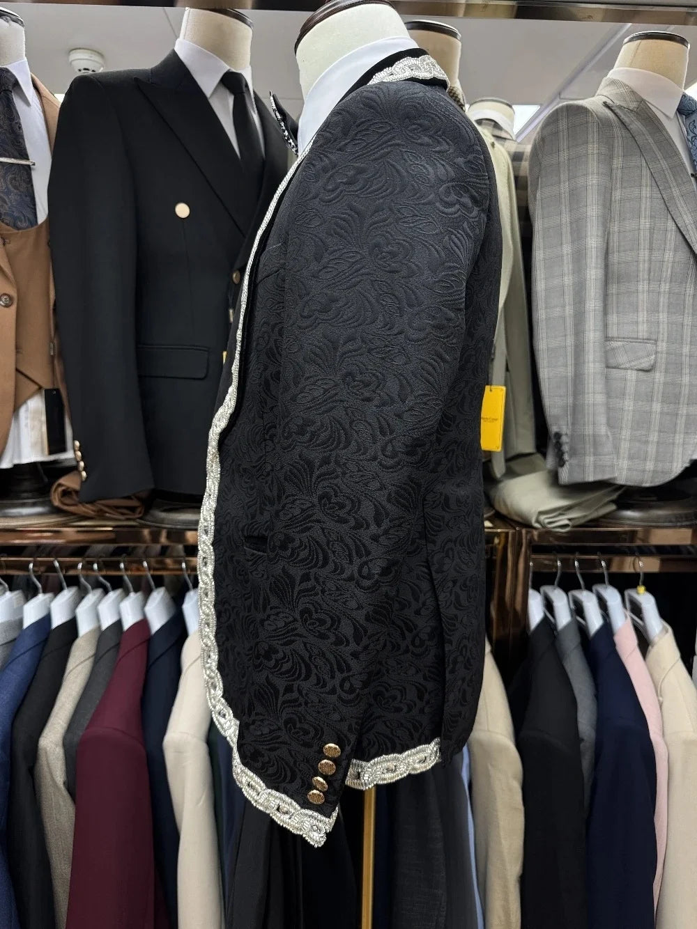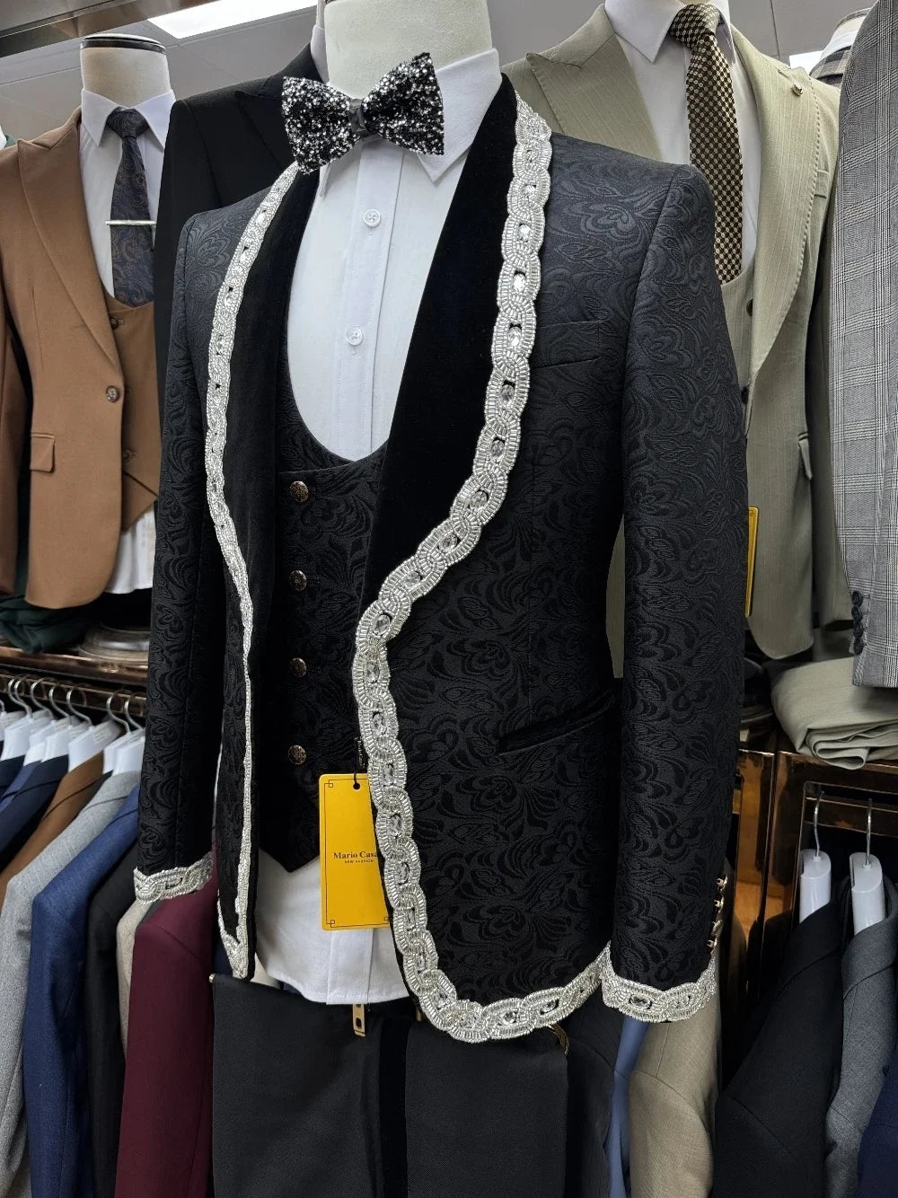Elegant Men Suits Tailor-Made 3 Pieces Shawl Lapel Jacket Beading Blazer Jacquard One Button Groom Customized Coat Vest Pants