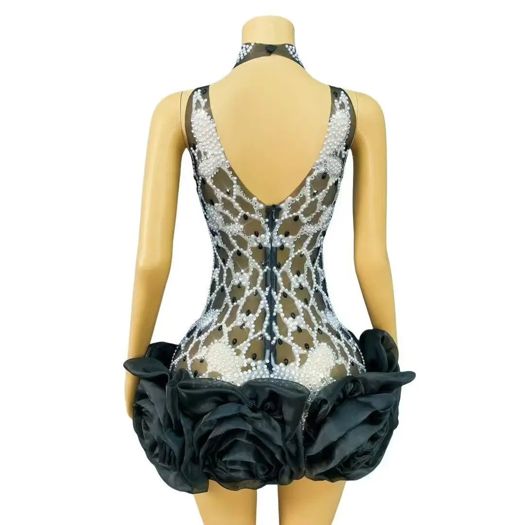 Elegantes guantes de falda corta con perlas y diamantes de imitación para mujer, de malla sexy transparente, para fiesta de noche, celebración de cumpleaños, vestido para sesión de fotos