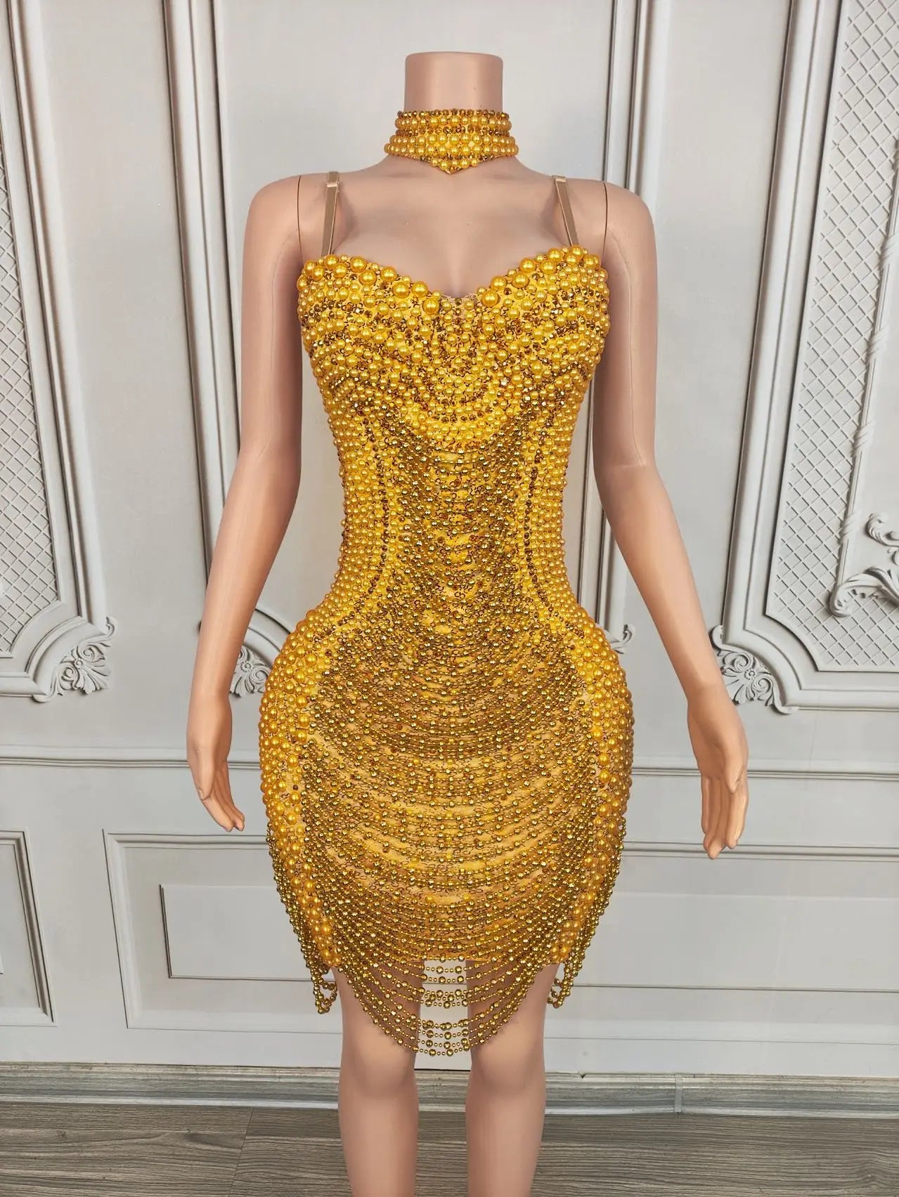 Step into elegance with this stunning women’s evening dress, exquisitely adorned with radiant golden pearls for a luxurious, high-end look. Perfect for birthdays, parties, photo shoots, festivals, and special celebrations, this eye-catching gown showcases timeless sophistication and graceful style. Make every moment unforgettable in this dazzling outfit designed to turn heads at any upscale event.