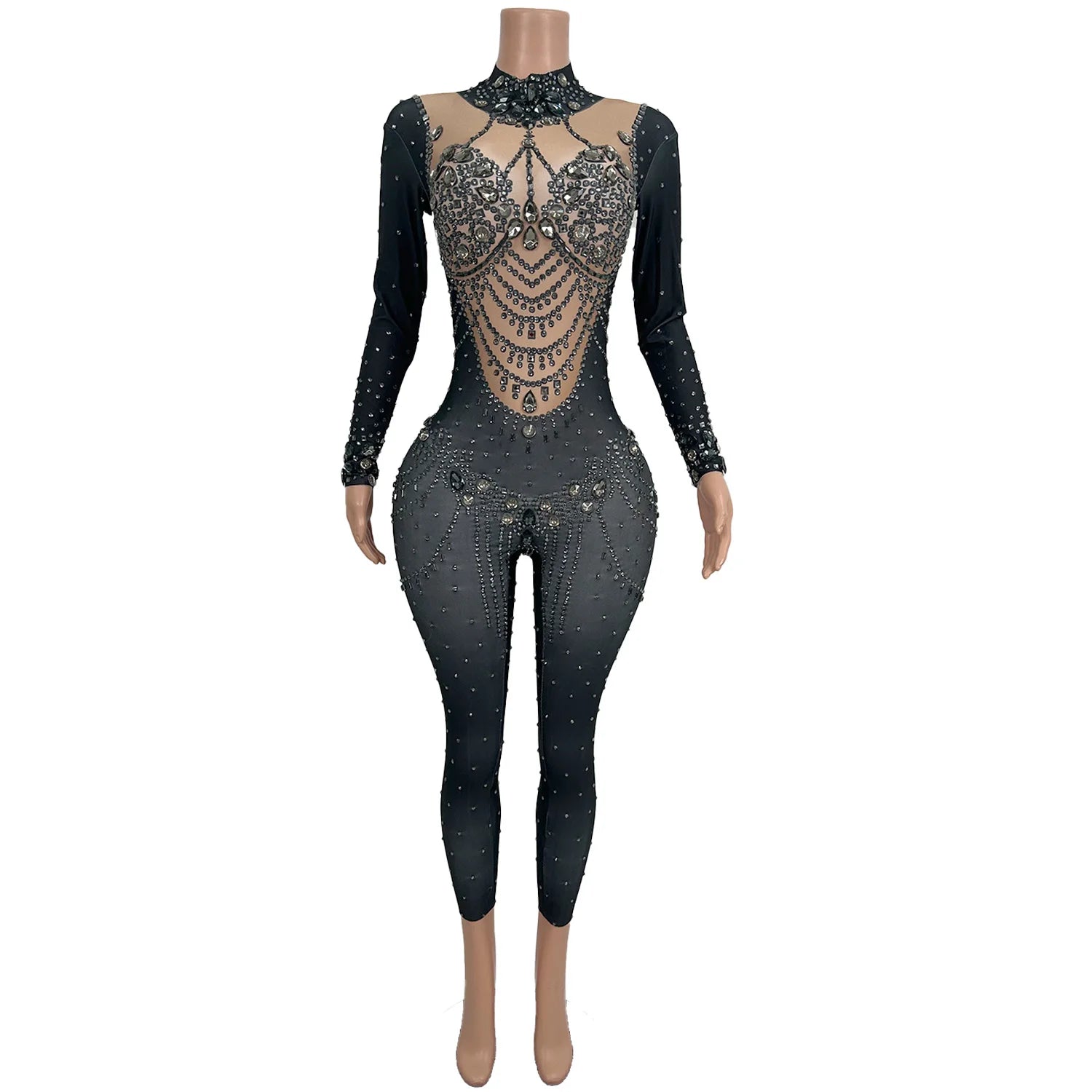 Light up the night in this Fancy Rhinestone Spandex Jumpsuit for women. Crafted from stretchy, tight-fitting spandex, this sparkling one-piece is covered in dazzling rhinestones for maximum shine and glamour. Perfect for nightclub events, stage performances, bar parties, or dancewear, this sexy jumpsuit hugs your curves and ensures all eyes are on you. Designed for confident women who love to stand out, this outfit brings both style and comfort to every celebration.