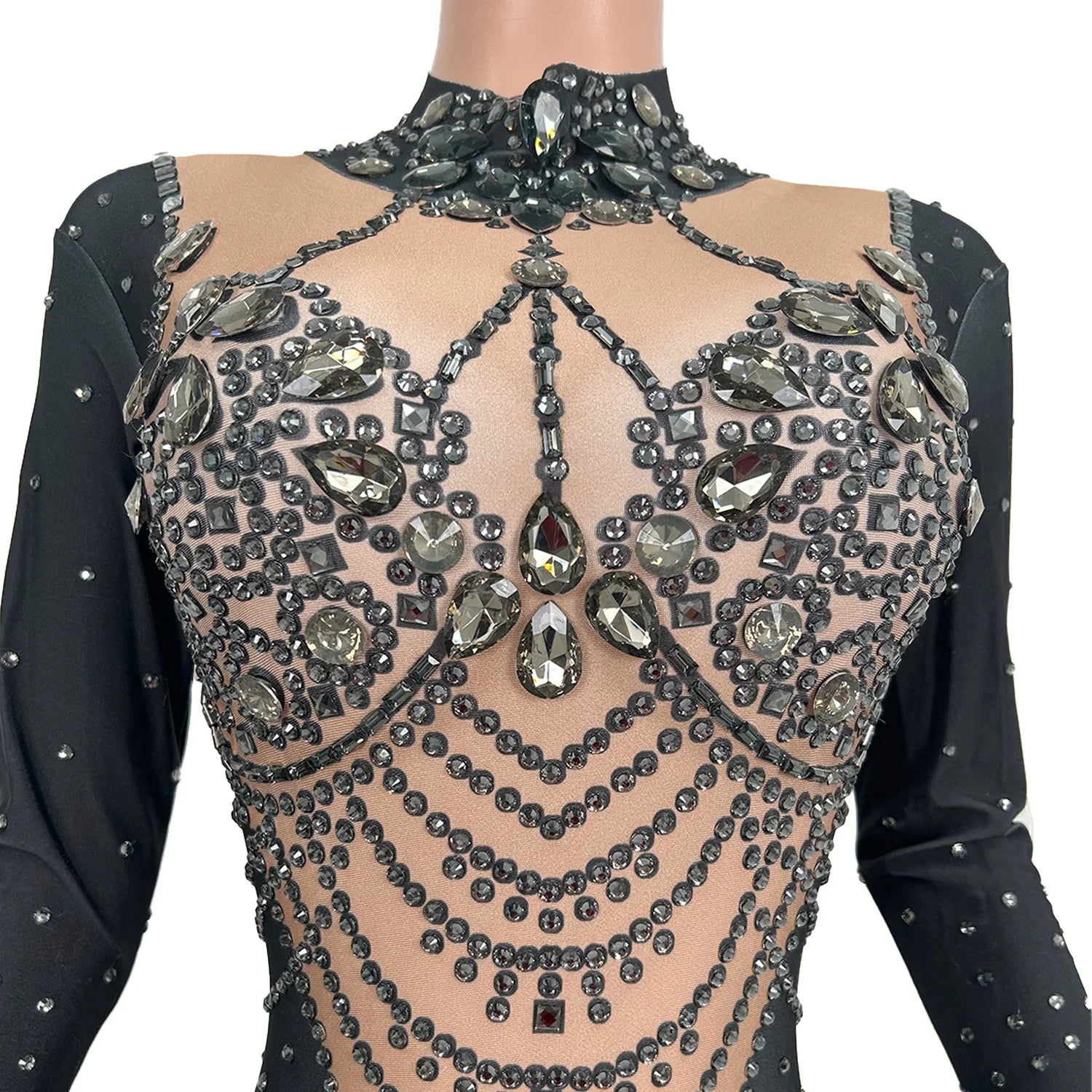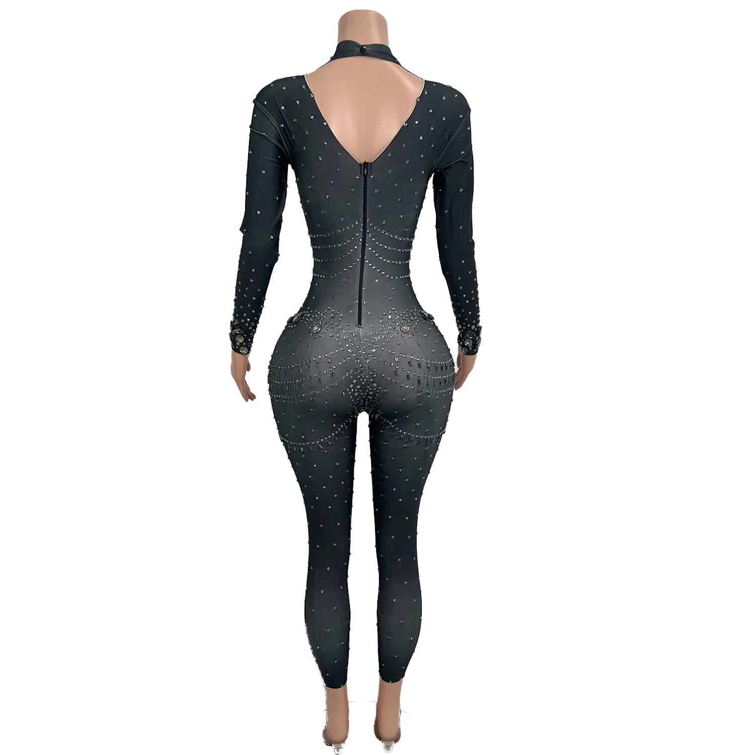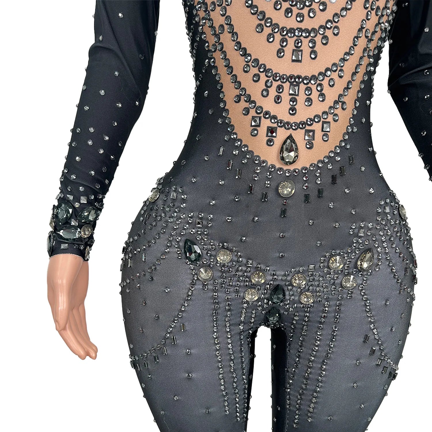 Fancy Rhinestone Spandex Tight Fitting Sparkly Jumpsuit Nightclub Stage Performance Dancewear Sexy Women Bar Party Outfit
