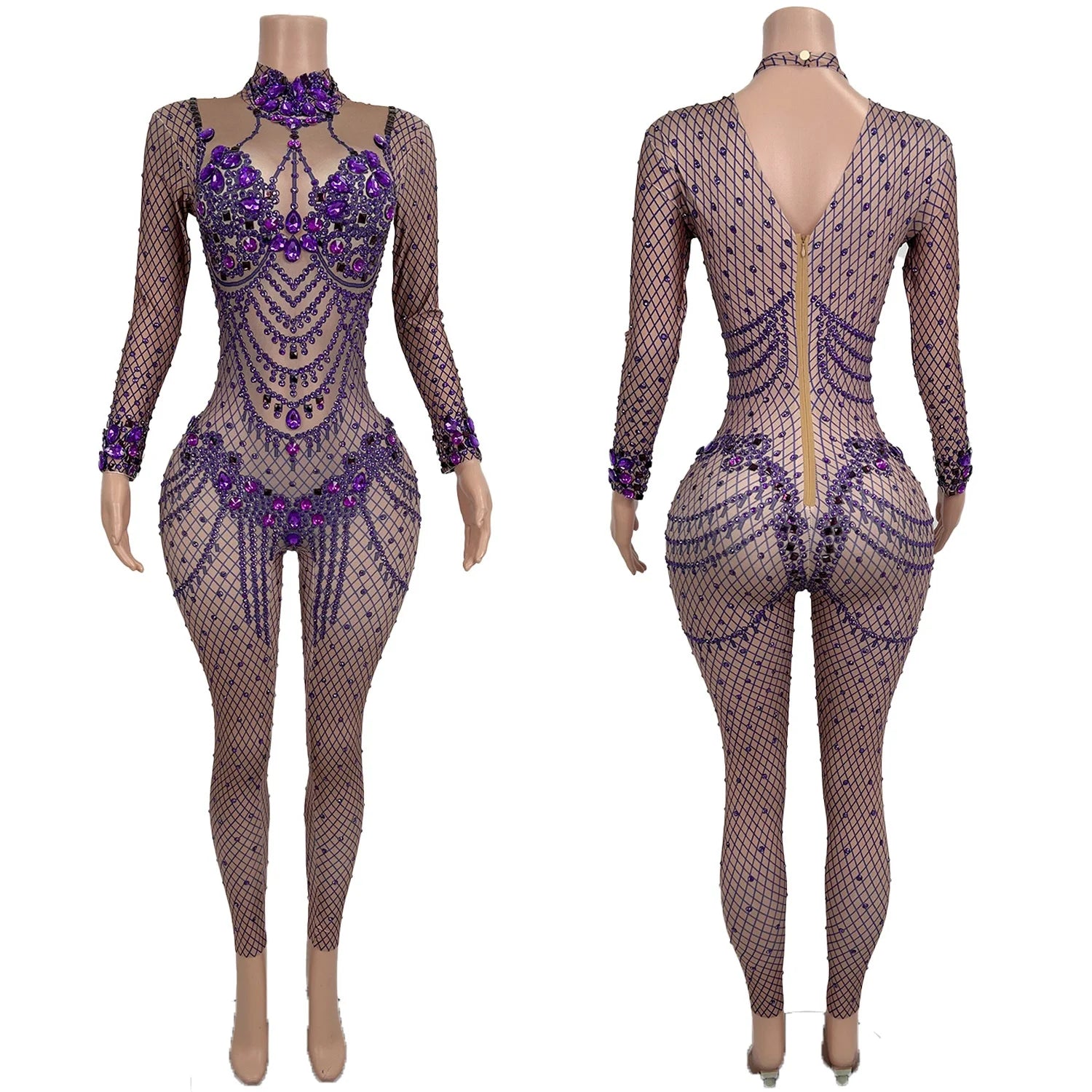 Dazzle the crowd in this fancy rhinestone jumpsuit, crafted from stretchy spandex for a sleek, tight-fitting silhouette. Adorned with sparkling rhinestones, this sexy one-piece is perfect for nightclub parties, bar events, dance performances, or stage shows. Designed to highlight your curves and shimmer under the lights, it’s the ultimate statement outfit for women who love to stand out.