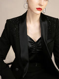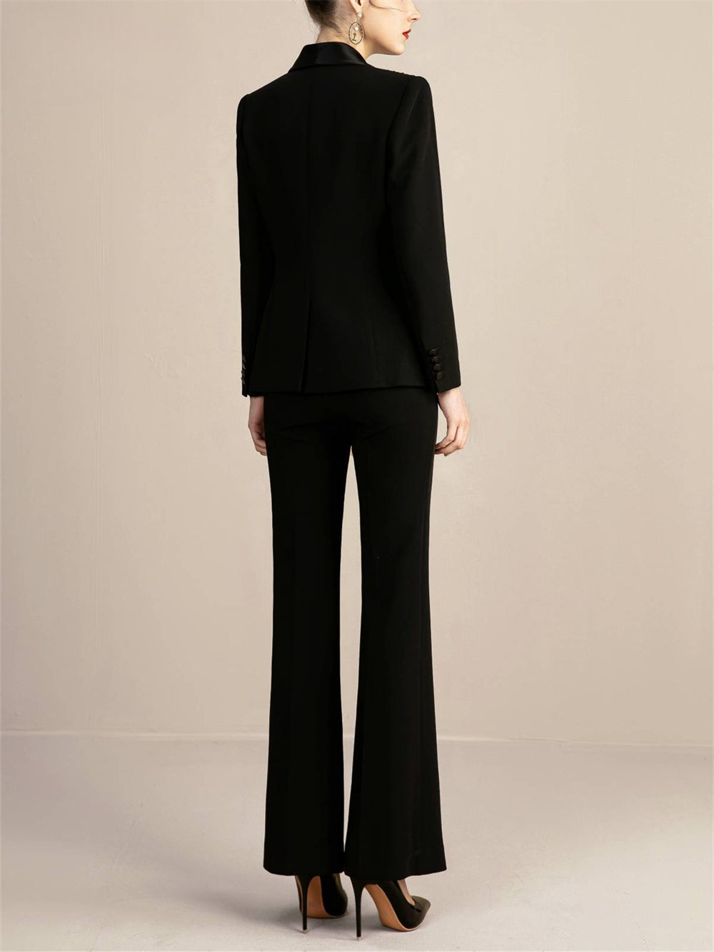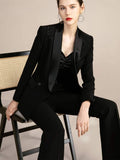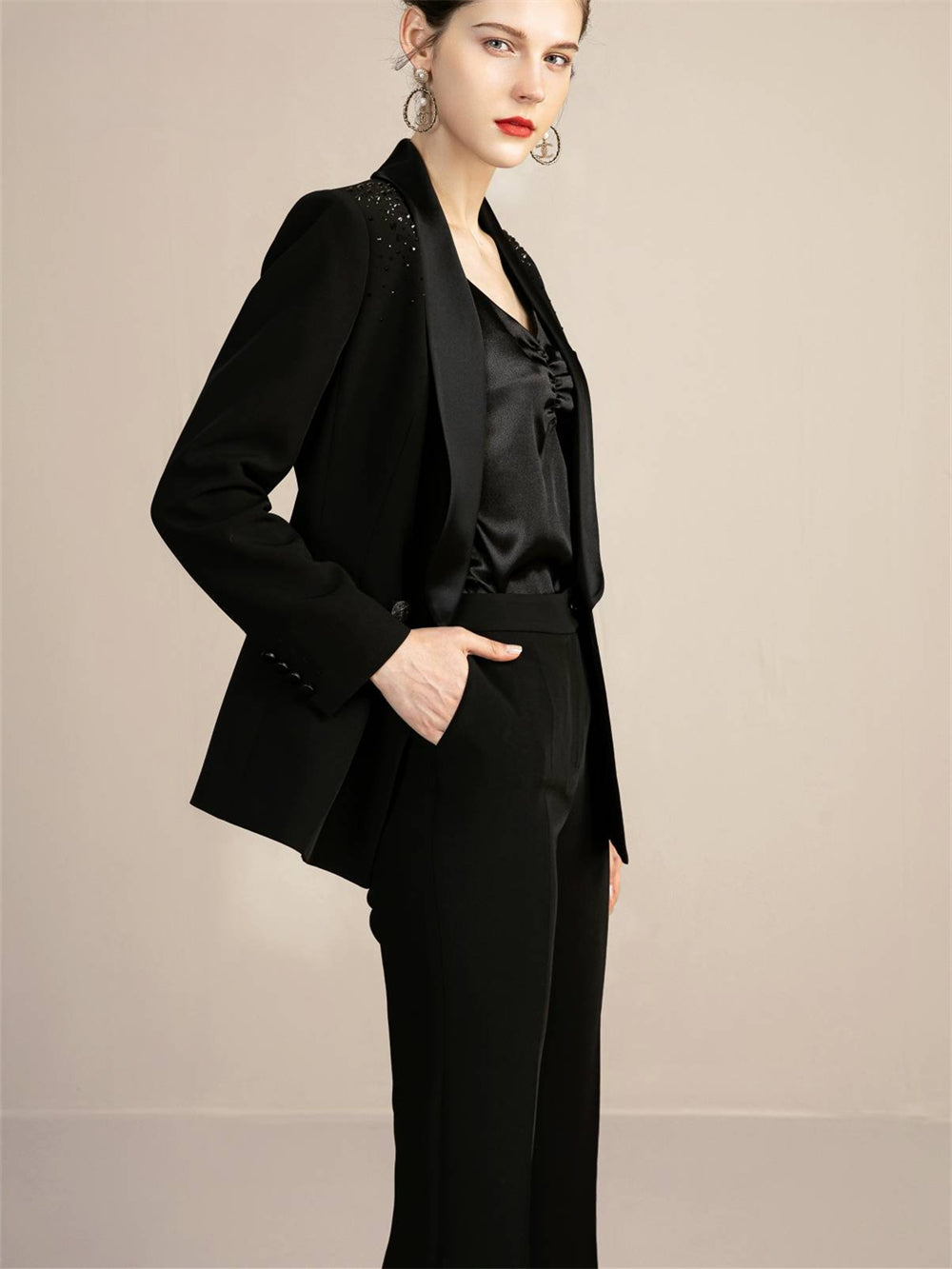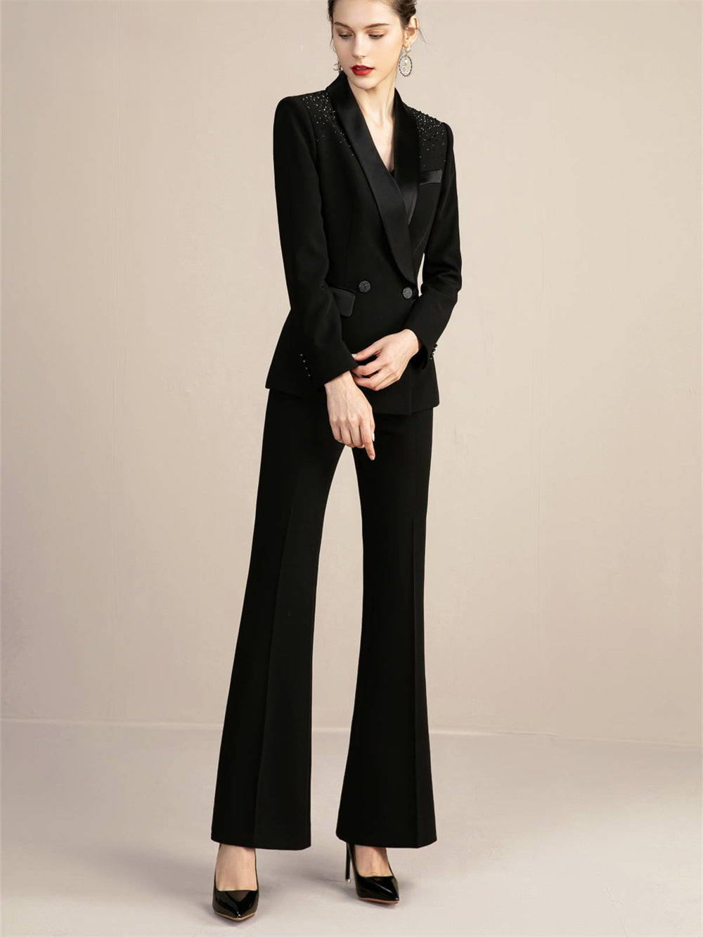 Elegante traje negro cruzado para mujer con detalles brillantes, pantalón de dos piezas con cuello sedoso y manga larga para un estilo chic otoñal.