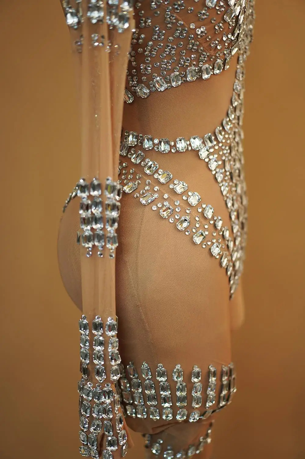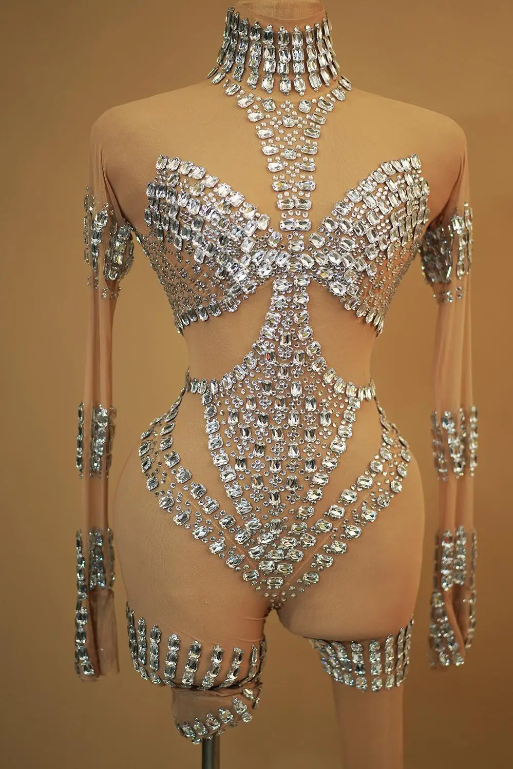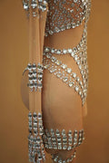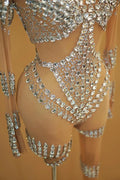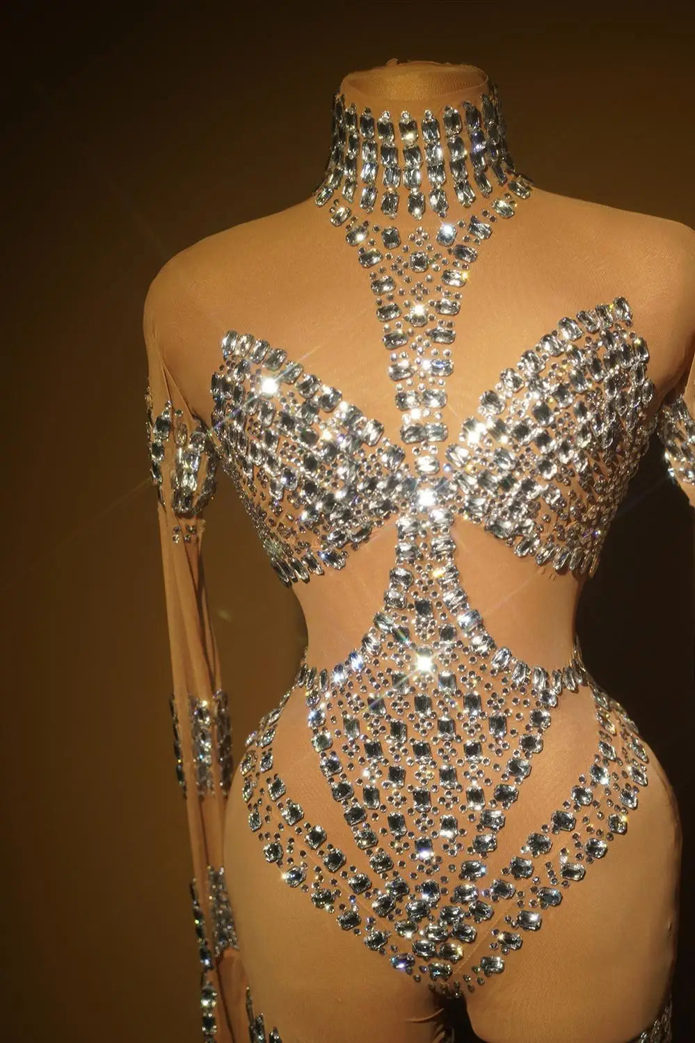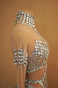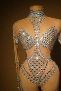 A high-impact, celebrity-style stage jumpsuit designed for performers, DJs, singers, and red-carpet entertainers. Features long sleeves, bodycon fit, crystal and sequin mesh panels, and couture-level detailing for maximum sparkle under lights.