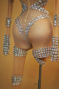Fashion Celebrity Superstar Performance Costume Stage Wear Women Long Sleeve Sparkly Crystal Mesh Bodycon Jumpsuit