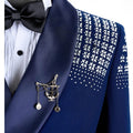 Tailor‑made double‑breasted tuxedo set featuring a smooth shawl lapel blazer embellished with high‑grade rhinestones, paired with matching tailored trousers. Perfect for grooms, groomsmen, and formal events where refined sparkle and impeccable fit matter.