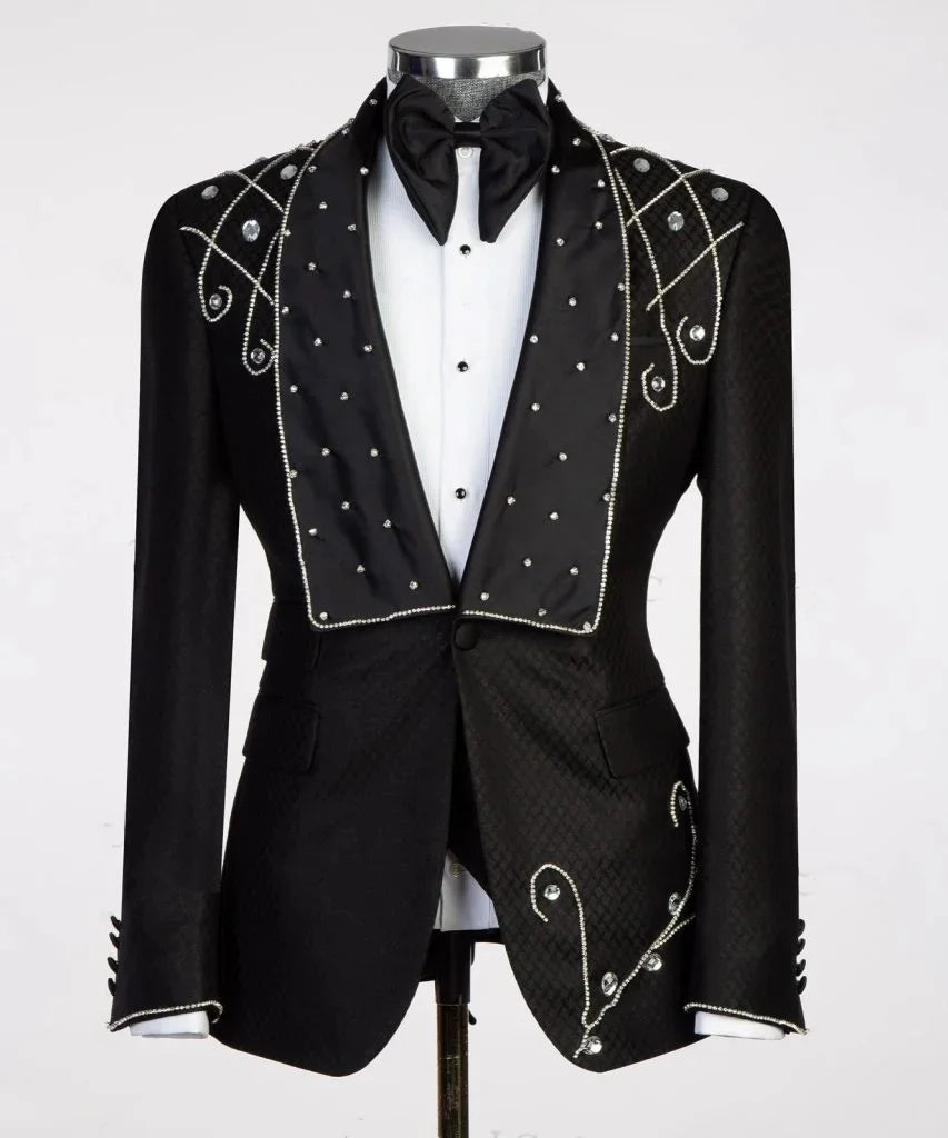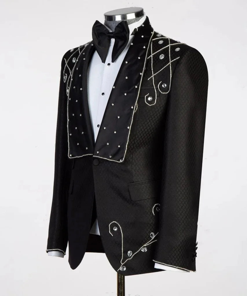 Elevate wedding-day style and formal wardrobes with this Fashion Men’s Suit — a tailor-made, two-piece groom blazer set that blends contemporary tailoring with luxurious, eye-catching embellishment. Designed for the modern groom or any man who wants to make a memorable entrance, the set includes a fitted blazer with a classic peaked lapel and matching trousers, both fully customizable to your measurements and style preferences for a flawless made-to-order fit.