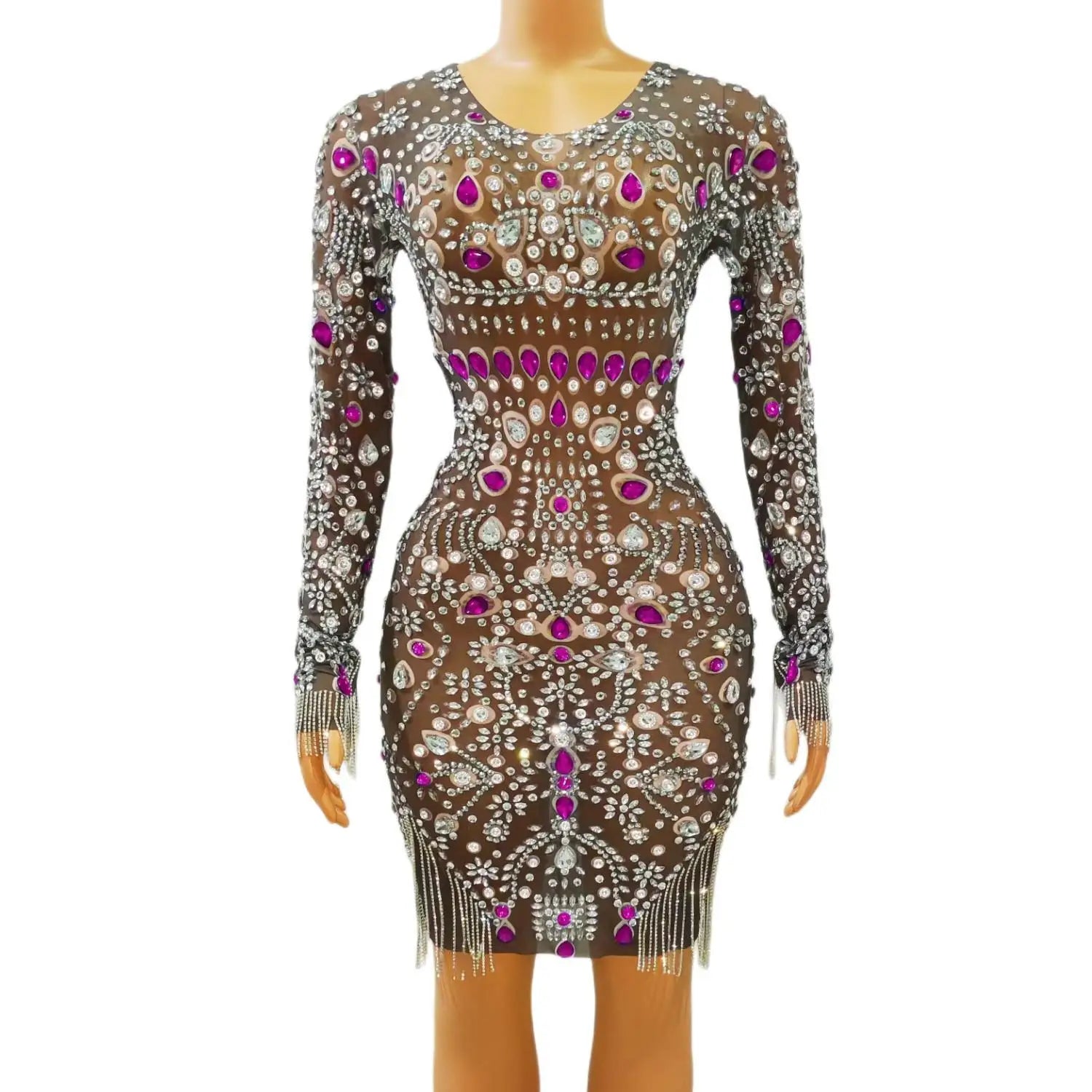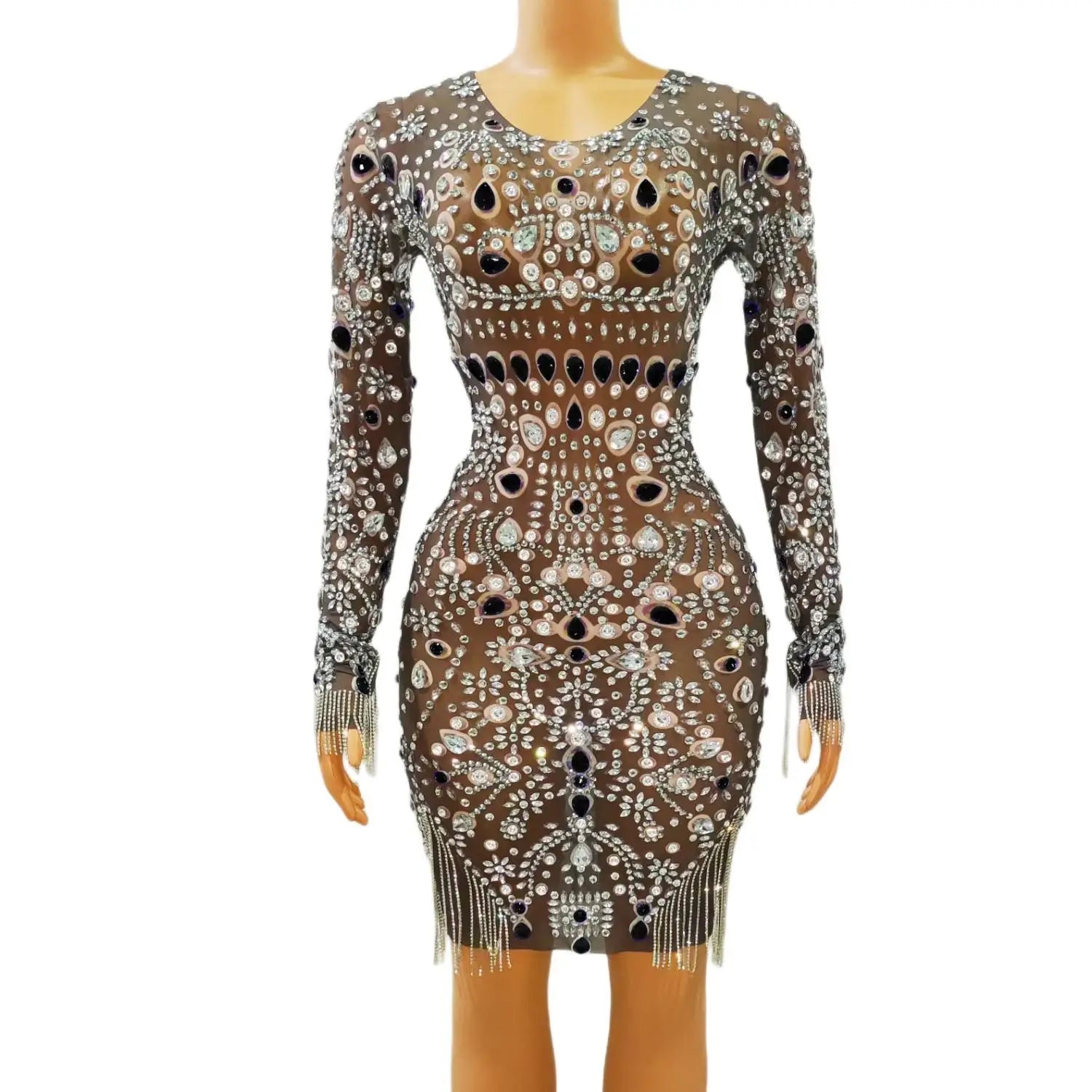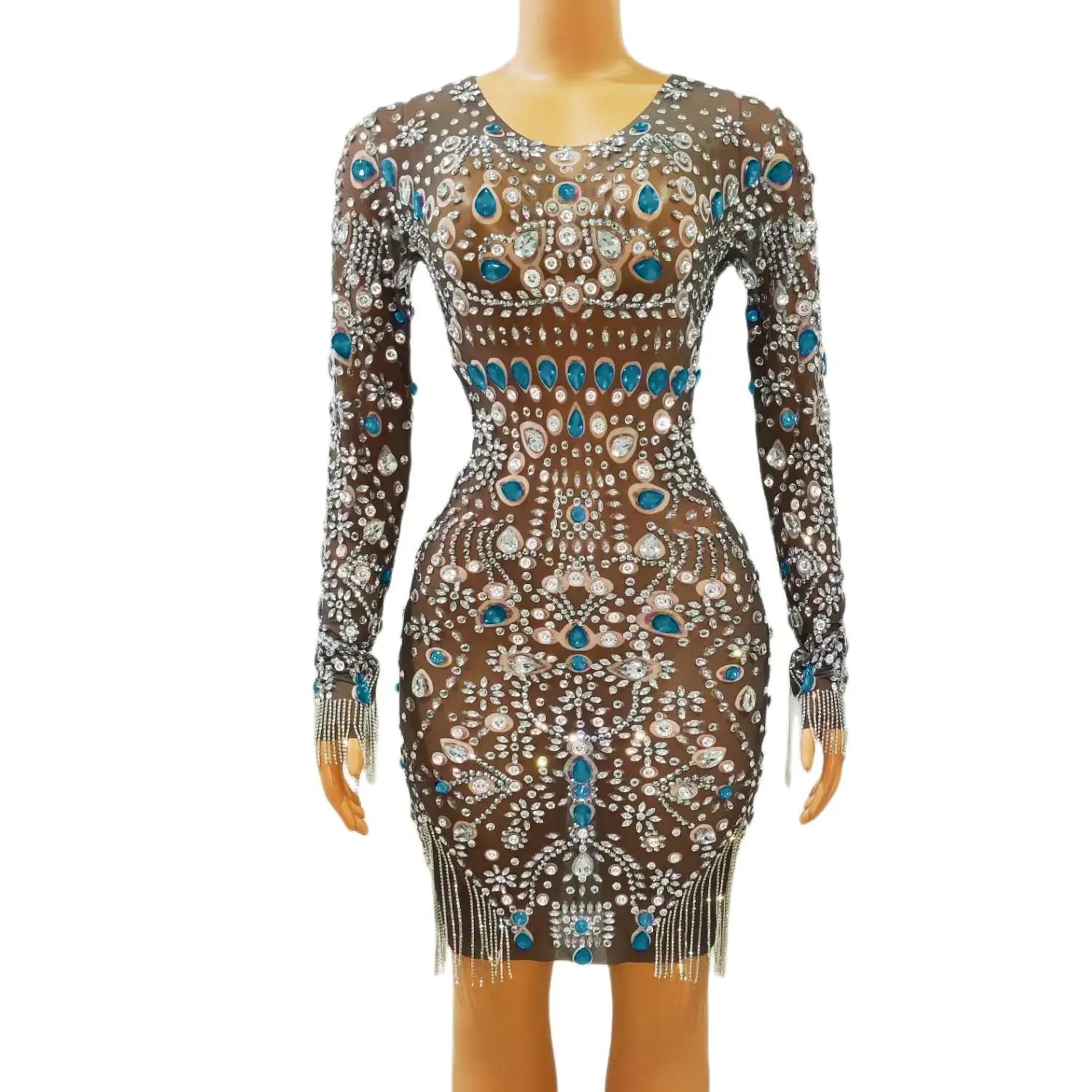 Fashion Rhinestones Transparent Summer Dress Birthday Evening Celebrate Costume Women Dance Prom Performance Dress