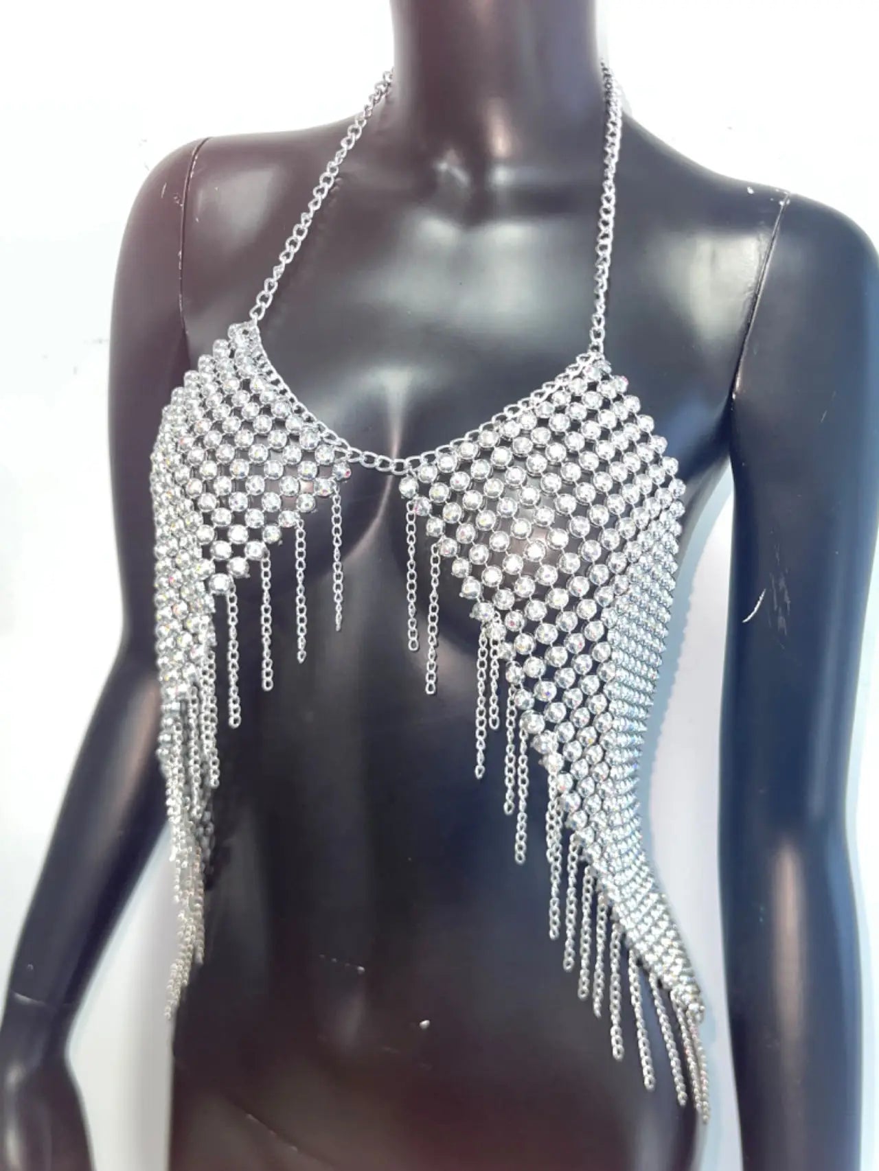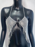 Shine and sparkle at any event with this stunning silver halter tank top. Adorned with glittering diamond-like embellishments and shining metal sequins, this gorgeous backless bustier crop top is perfect for clubs, parties, and festivals. The bold design and eye-catching shimmer make it an unforgettable choice for those who love to stand out and make a statement on the dance floor.
