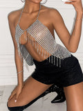 Fashion Silver Halter Tank Top Glitter Diamonds Bustier Tops Gorgeous Backless Metal Sequin Crop Top Club Vest Festival Outfits
