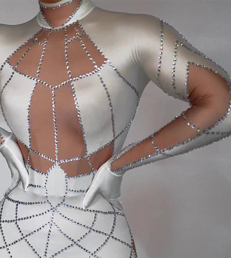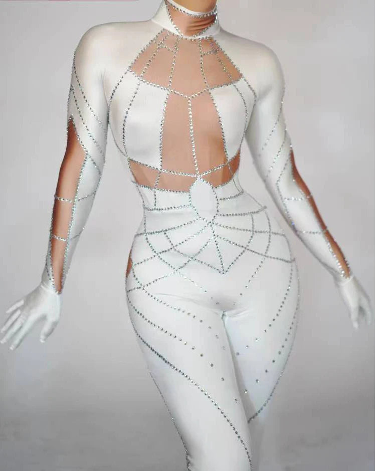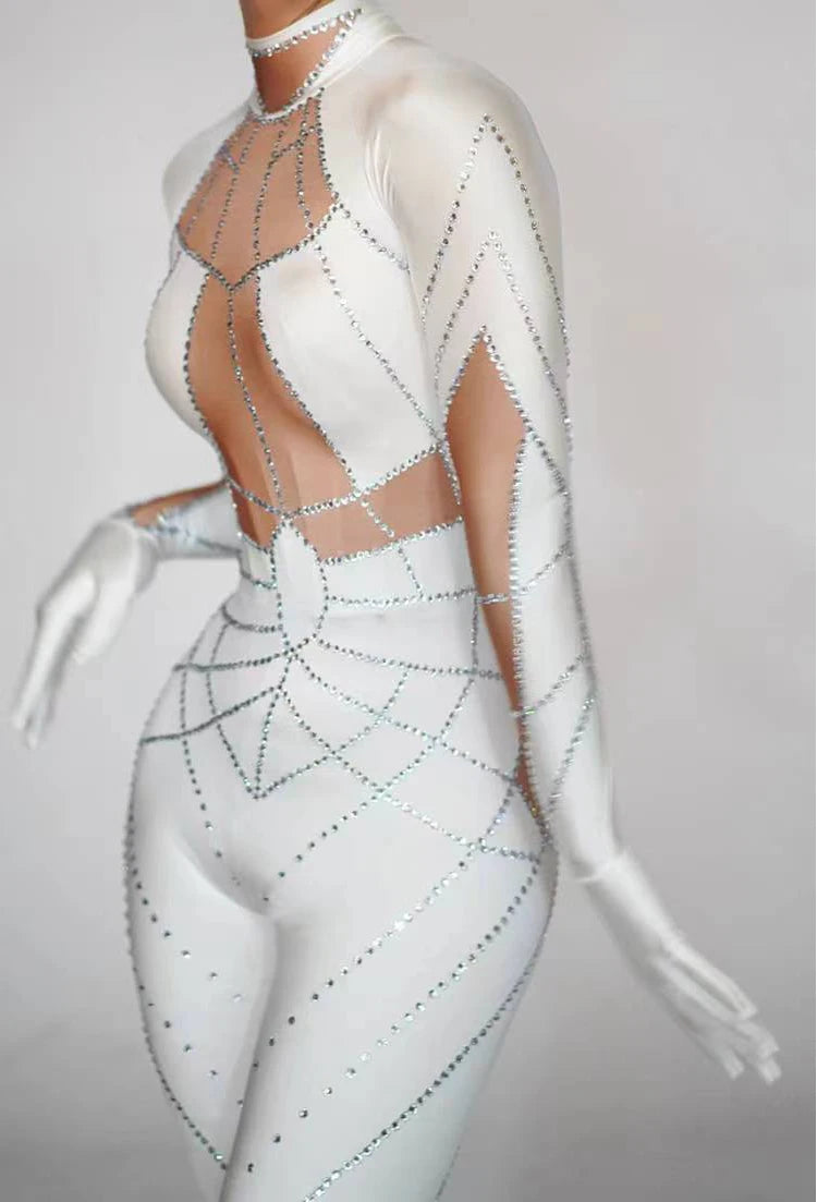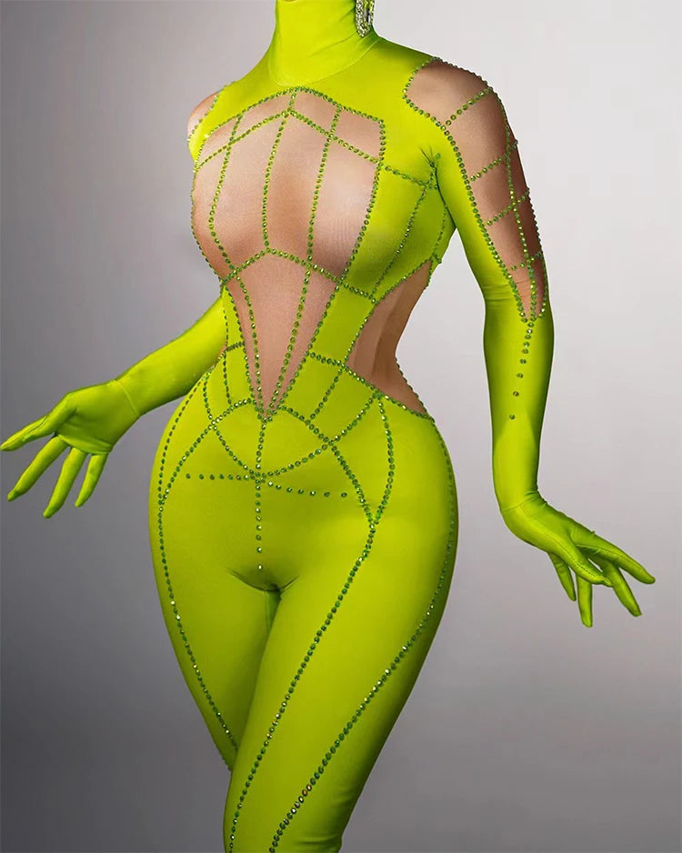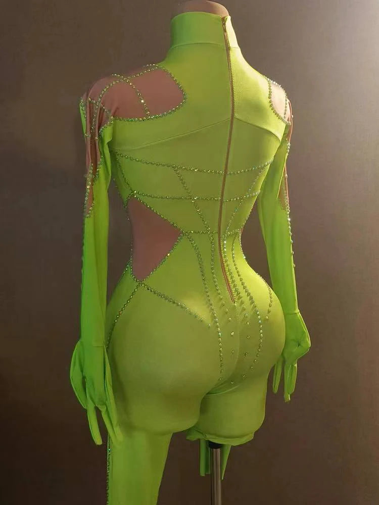 Make a bold statement in this fashionable white and green women’s jumpsuit, featuring long sleeves and matching gloves for a modern, coordinated look. Embellished with sparkling rhinestones, this sexy outfit is perfect for club parties, dance events, or singer stage performances. Designed to turn heads and catch the light, it’s the ideal costume for those who want to stand out and shine on any occasion.