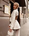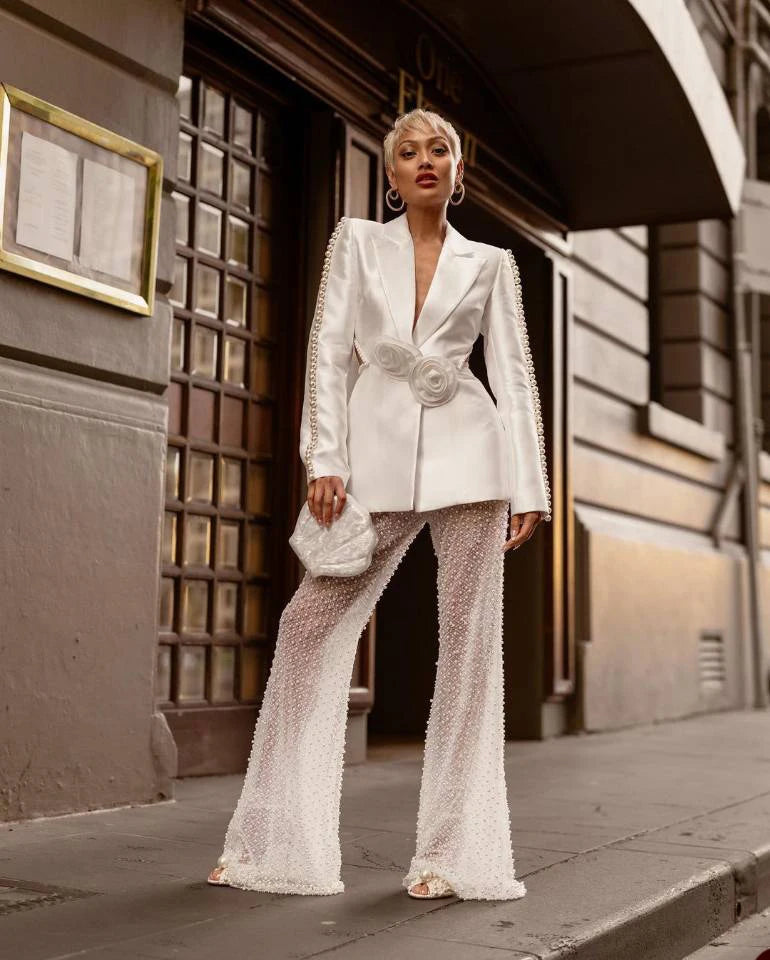 Make a graceful, unforgettable entrance with this Fashion Women Suit featuring delicate pearls and 3D floral appliqués. Designed for brides, evening events, and fashion-forward occasions, this two-piece ensemble combines romantic detailing with modern tailoring: a V-neck, backless long-sleeve coat paired with slim-fit pants for a flattering, contemporary silhouette. Fully custom-made to your measurements, it offers a couture finish and personalized embellishment choices to ensure the perfect fit and unique style.