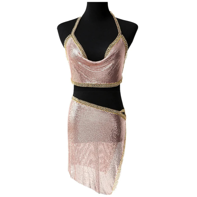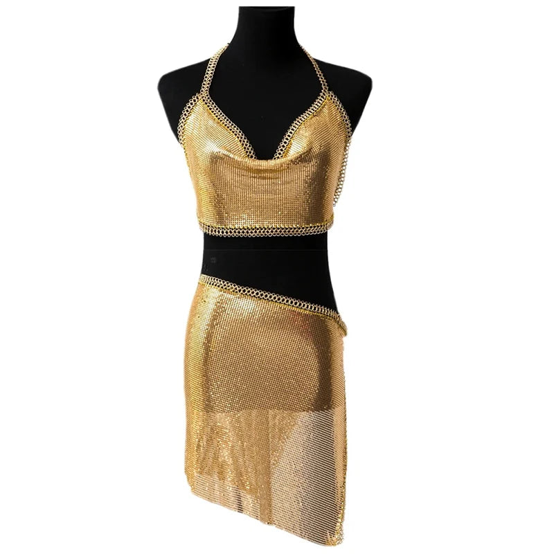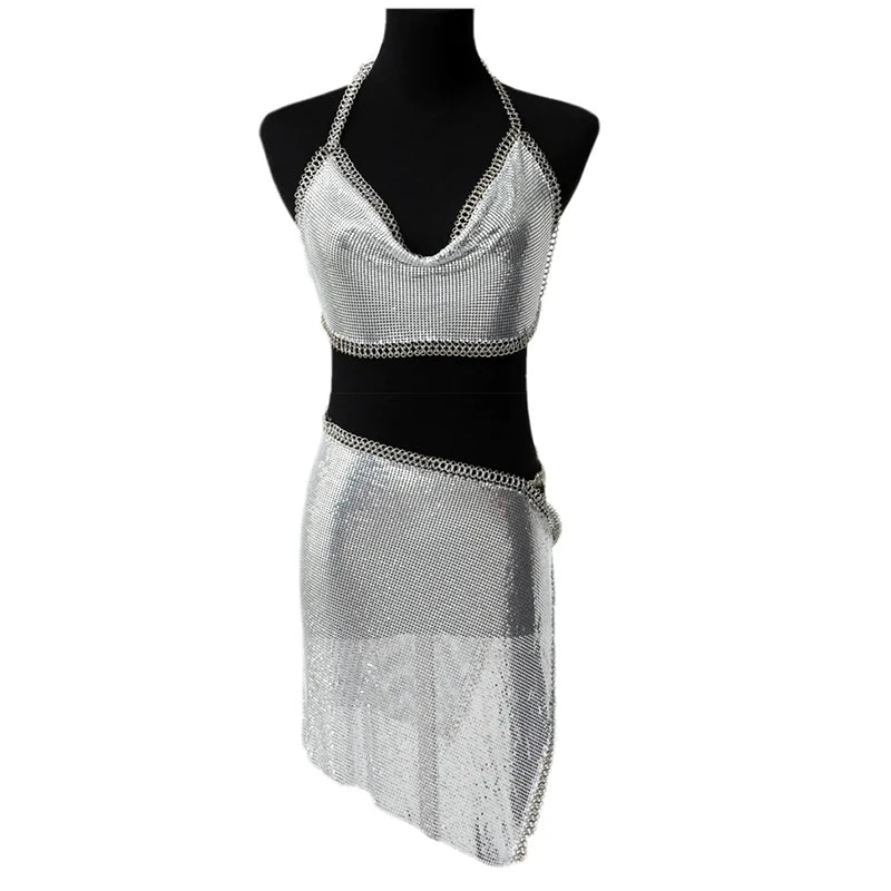 Turn heads at your next event with this striking metal mesh chain set for women. Featuring a dazzling halter chainmail cami top paired with a matching chain mini skirt, this gold or silver ensemble is designed for unforgettable club nights and parties. The shimmering metallic finish and daring design add bold glamour, making it the perfect statement outfit for those who love to stand out.