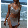 Female Gold Metal Mesh Top Chain Mini Skirt for Club Party Silver Halter Chainmail Cami and Skirt Set