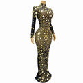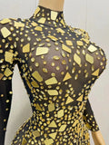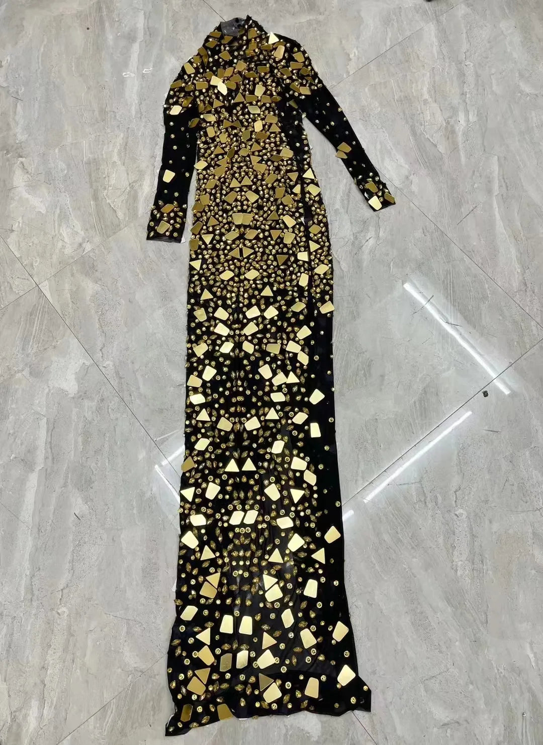A dramatic, high‑glam performance dress that combines gold mirror tiles, sparkling rhinestones, and sheer black mesh to create striking flashes on camera and under stage lights. Designed for birthday queens, performers, singers, and photoshoots, this long‑sleeve transparent costume balances daring illusion with reinforced construction for on‑stage confidence.