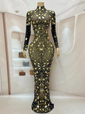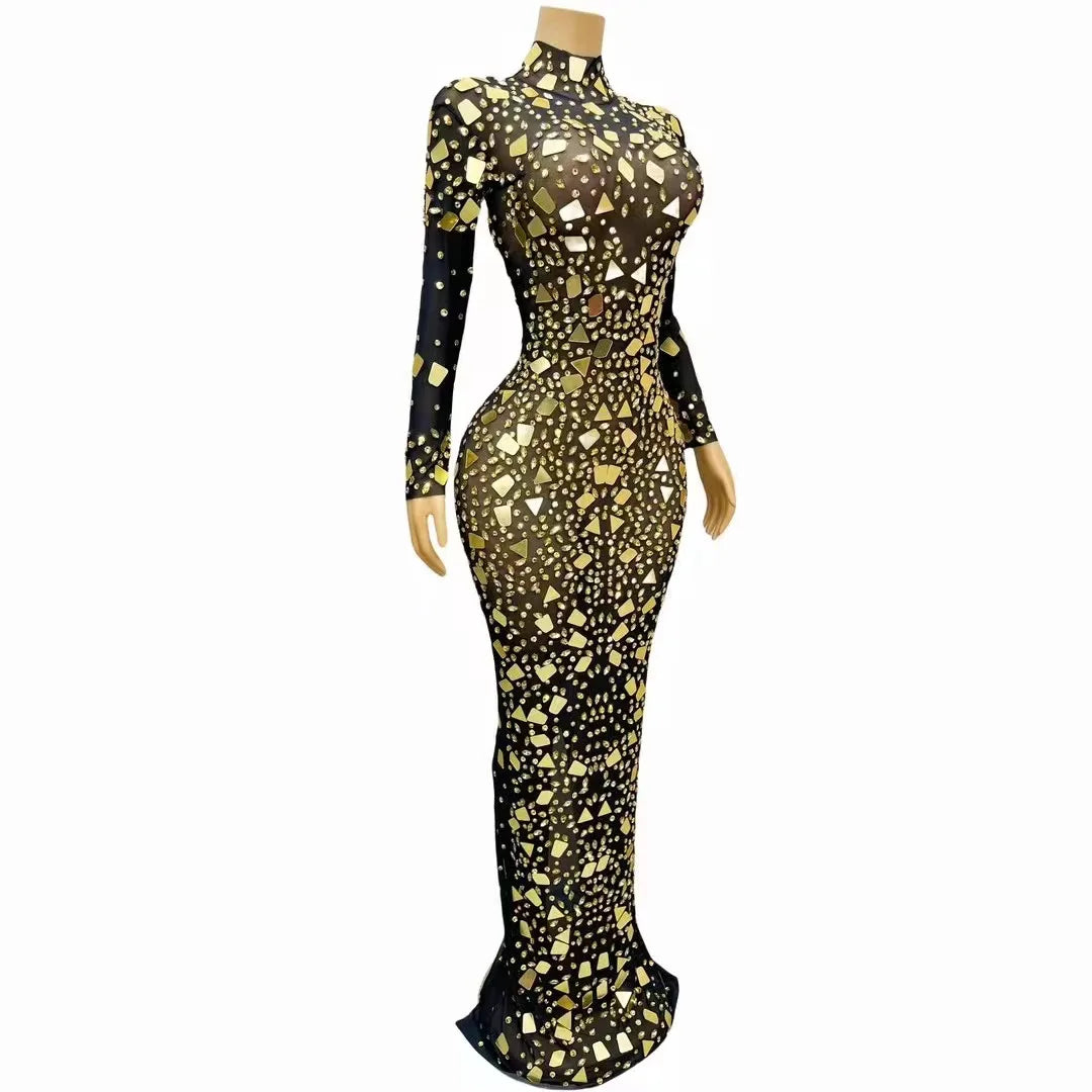 Flashing Gold Mirrors Birthday Celebrate Rhinestones Long Sleeves Dress Mesh Transparent Costume Fancy Black Photoshoot Outfit