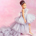 Vestido elegante de tul gris con volantes en capas para niñas, corpiño con plumas y diadema a juego.