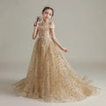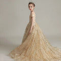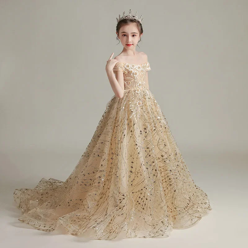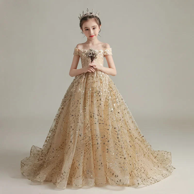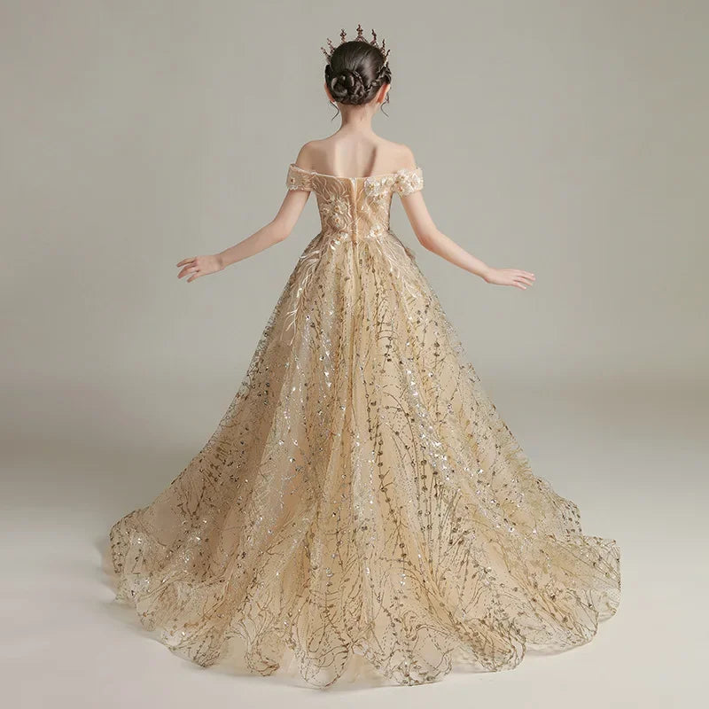 Deja que tu adolescente brille en cualquier ocasión especial con este elegante vestido de hombros descubiertos. Diseñado para niñas de las flores y damas de honor, este vestido presenta un exquisito bordado, un lujoso color dorado y un elegante diseño de cola. Perfecto para bodas, fiestas de Halloween y eventos formales, este vestido infantil combina sofisticación con comodidad para un look inolvidable.