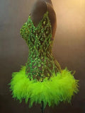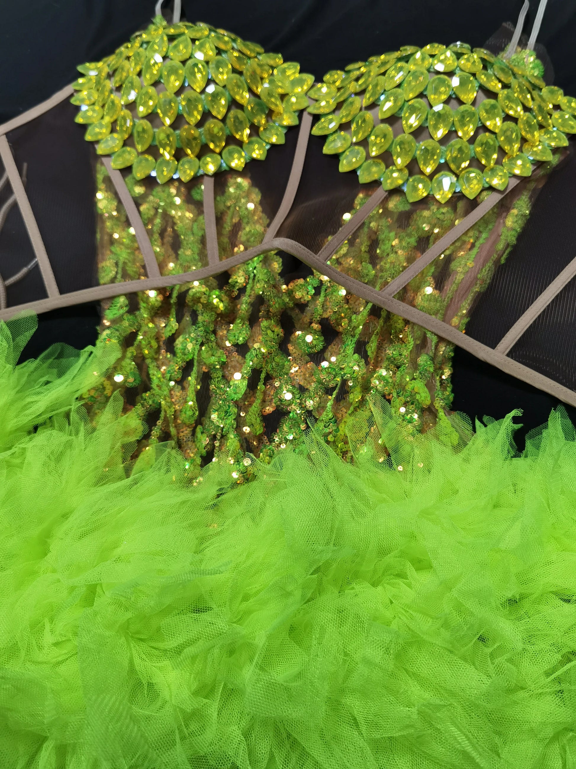 Fluorescent Yellow Rhinstone Mesh Tube Top Evening Dress Sing Gala Elegant Women Party Birthday Special Ocassion Sexy Costume