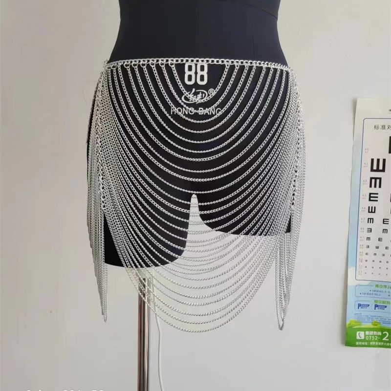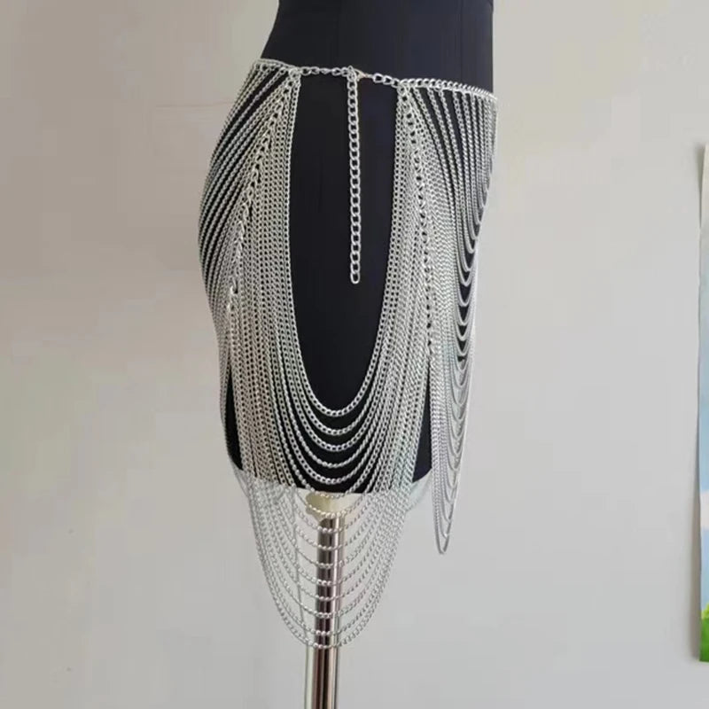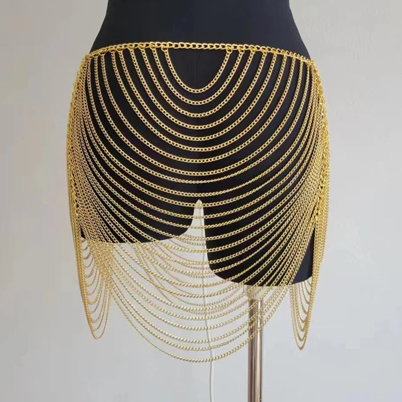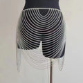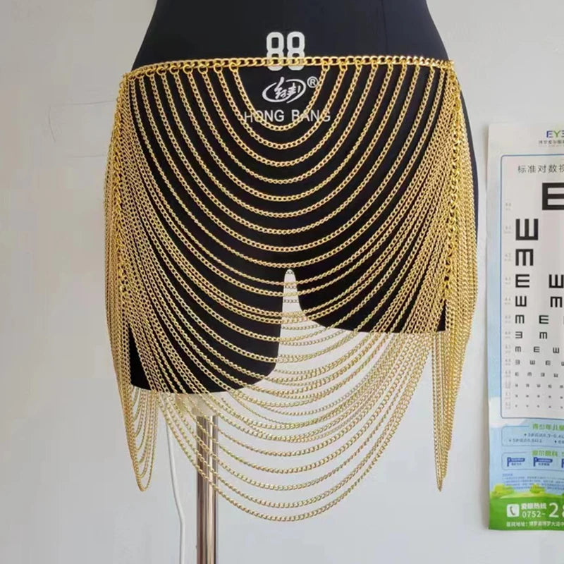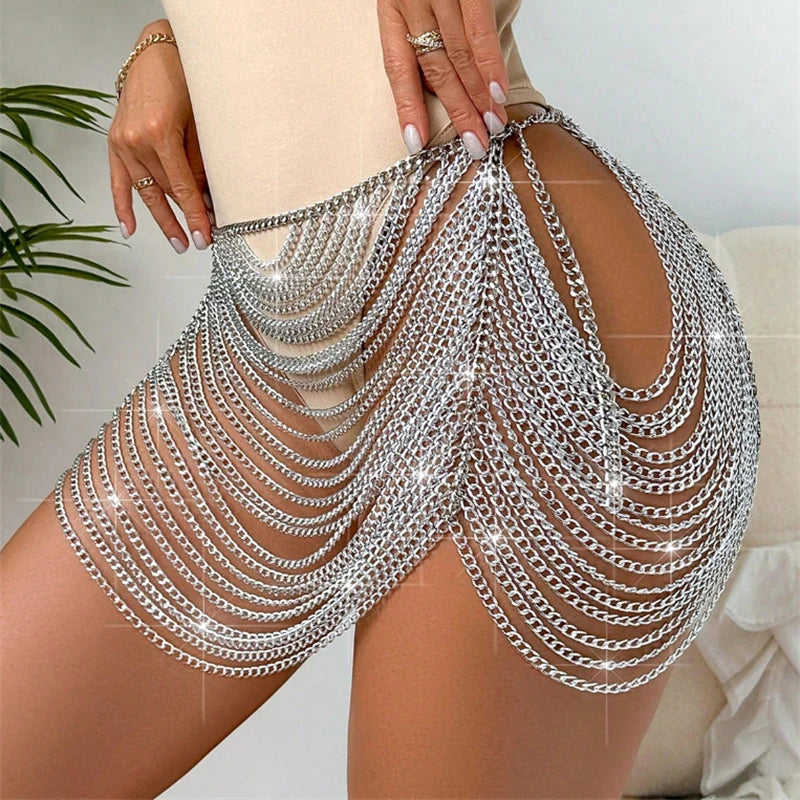 Shine on the dance floor or at the beach with this Gold & Silver Body Chain Mini Skirt for women. Designed for night club wear and resort style, this fashionable skirt features a dazzling metallic body chain design, sultry hollow cutouts, and playful tassel accents. Perfect as a statement piece over bikinis or as an eye-catching layer for summer parties, it offers on-trend glam for music festivals, holidays, and beachwear. Layer it over your favorite bottoms or bikini for a bold, head-turning look
