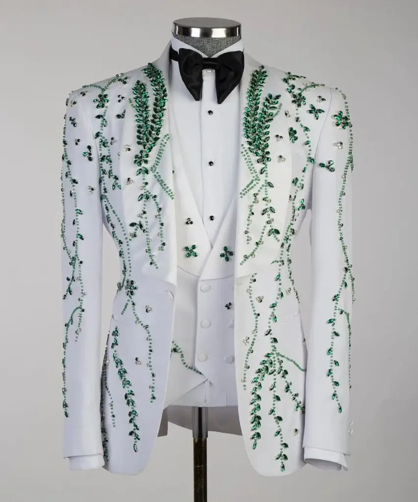 Step into the spotlight with this Gorgeous Men’s Suit — a tailor-made two-piece set designed for the groom or any style-conscious man who wants refined luxury with dazzling detail. This ensemble features a shawl-lapel, one-button blazer and coordinating trousers, enhanced by hand-applied crystal beadwork that adds elegant sparkle while preserving a polished, modern silhouette.
