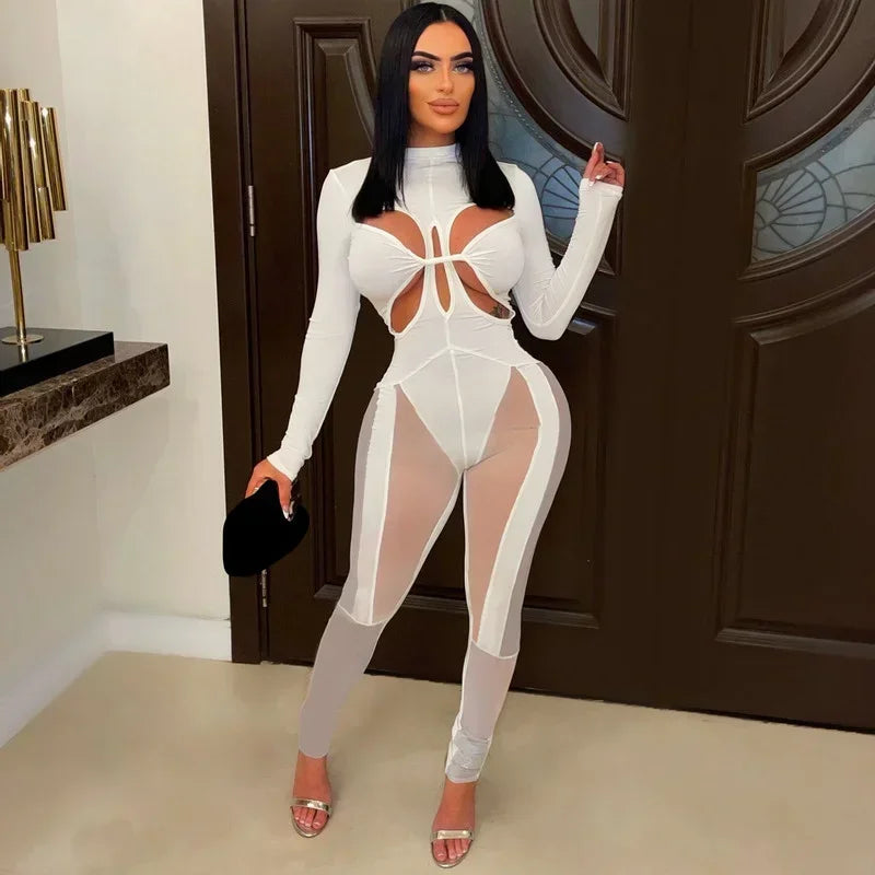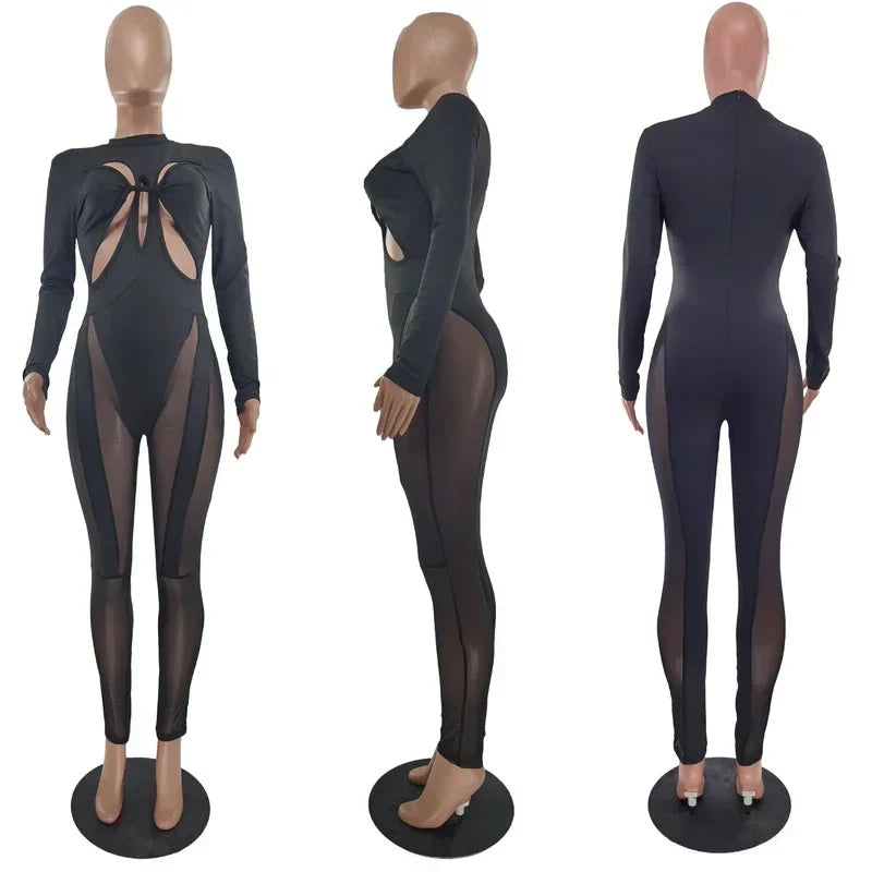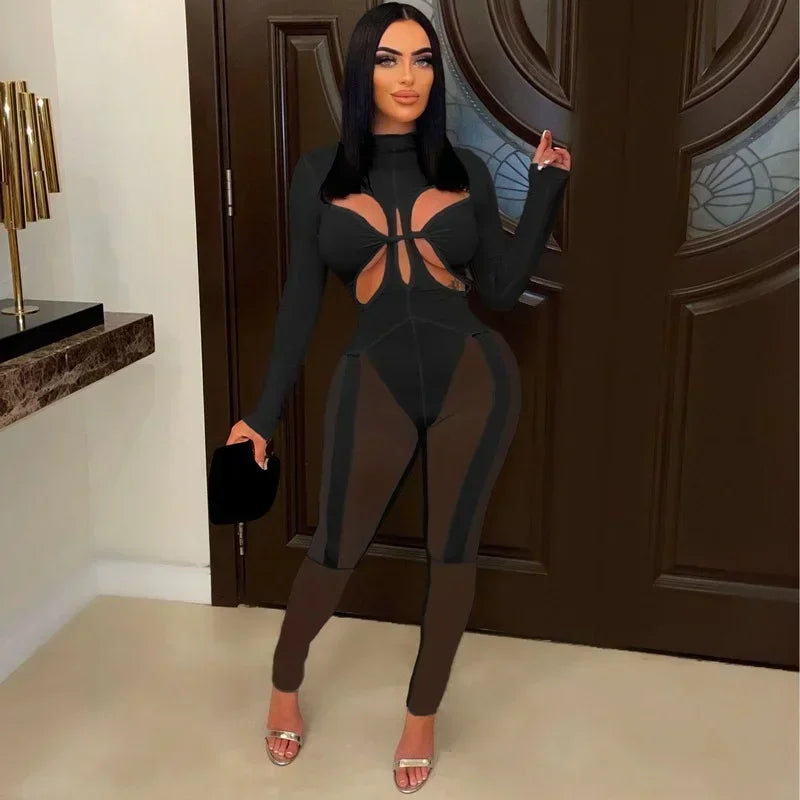 Turn heads on your next night out with this sexy mesh patchwork jumpsuit for women. Featuring bold cut-out details, a flattering high waist, and long sleeves, this skinny stretch overall is designed to hug your curves and show off your figure. The daring hollow-out accents and sleek silhouette make it the perfect outfit for the club or any special evening event where you want to stand out.