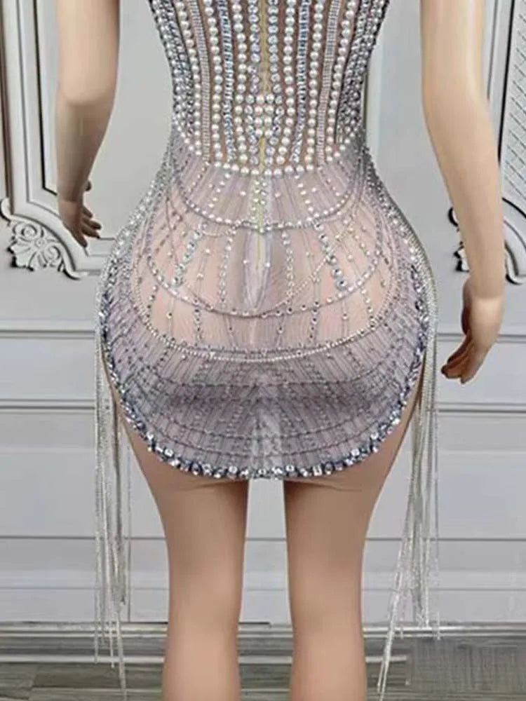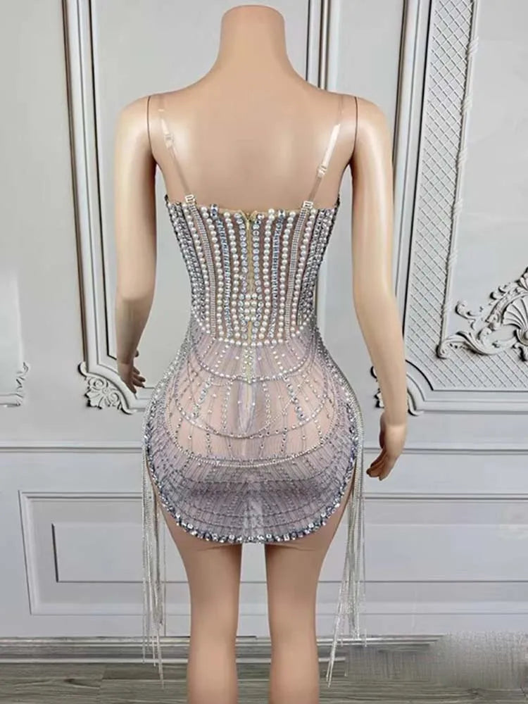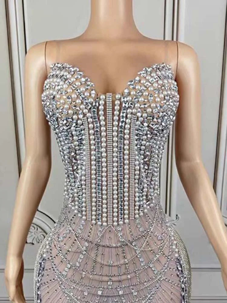 Atrae todas las miradas con este vestido sin tirantes de alta calidad, diseñado para mujeres que buscan destacar. Con deslumbrantes adornos de cuentas y diamantes, esta nueva pieza de moda brilla desde cualquier ángulo. Los elegantes detalles de borlas aportan movimiento y un toque de lujo, mientras que la silueta estilizada garantiza un look sexy y sofisticado. Perfecto para eventos especiales, fiestas u ocasiones especiales, este vestido combina glamour moderno con una confección impecable para mujeres que buscan el máximo estilo.