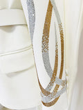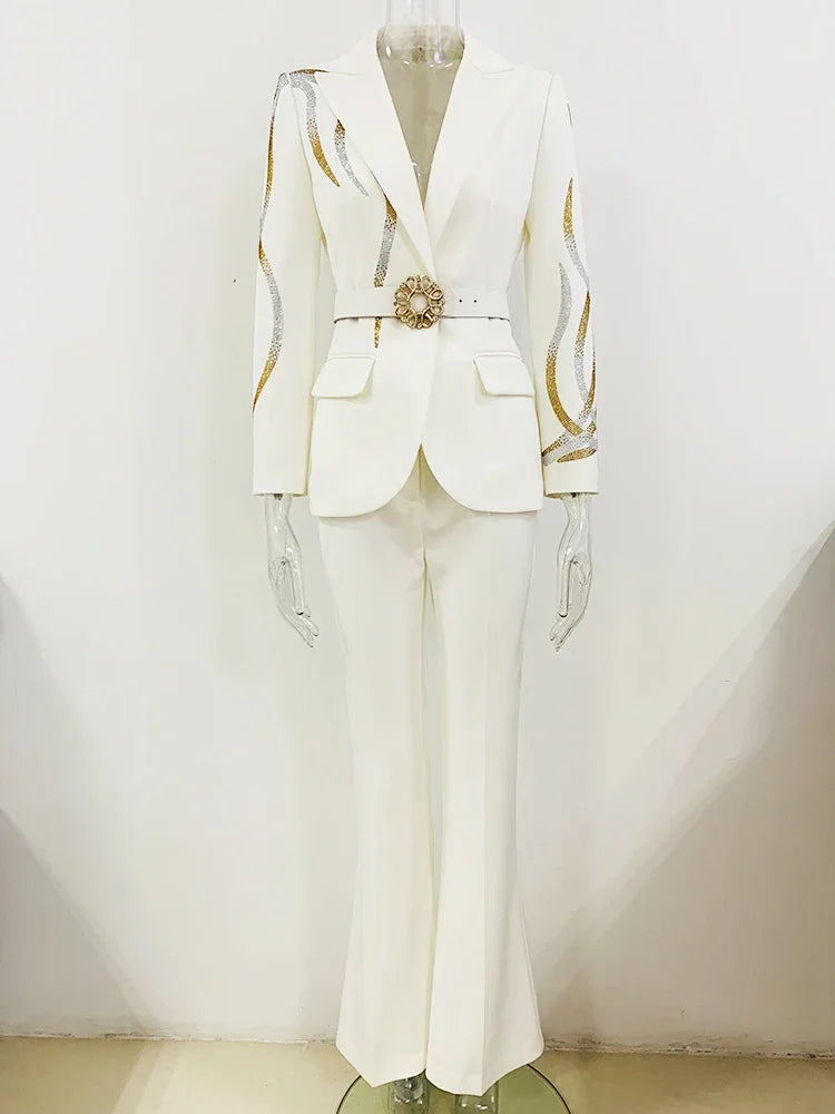 Elevate your wardrobe with a runway‑ready two‑piece that fuses bold color, sculptural tailoring, and sparkling diamond‑style embellishment. This set includes a belted blazer and high‑waist flare pants designed to make a statement at formal events, fashion shows, parties, and upscale evenings.