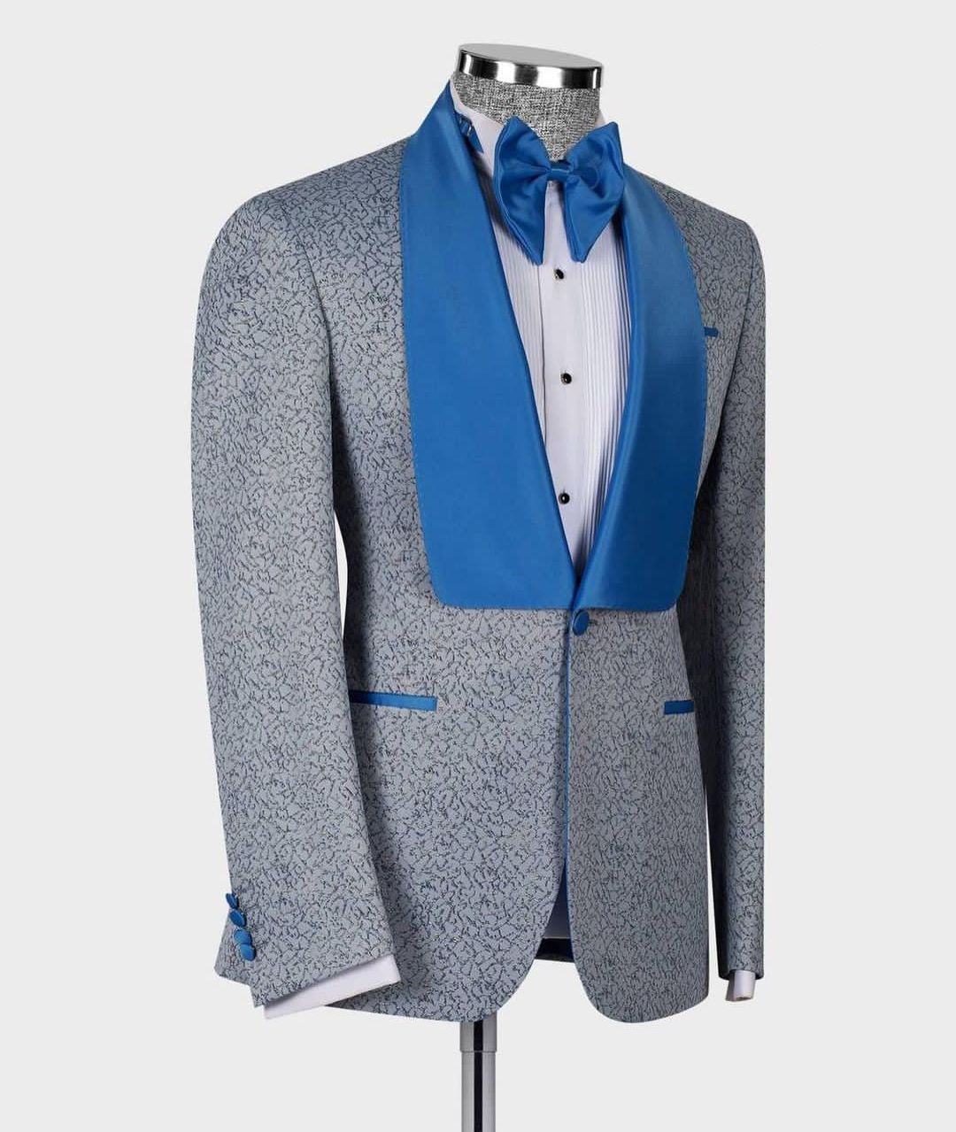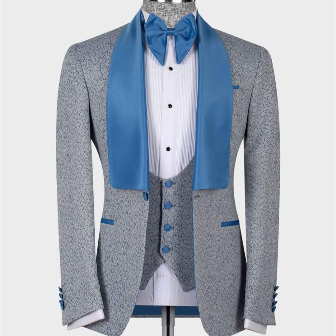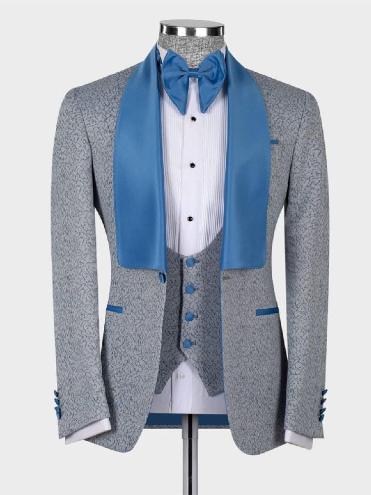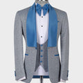 Traje de hombre Jacquard de 2 piezas, blazer gris, chaleco de un botón, satén azul, solapa transparente, traje de novio para boda, traje a medida para hombre