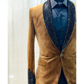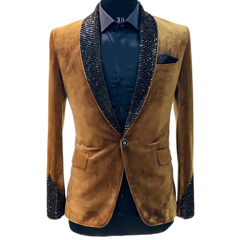 Luce un estilo único con nuestro traje formal de novio en terciopelo caqui, un lujoso conjunto de dos piezas que incluye una elegante chaqueta y un pantalón a medida. Este conjunto está adornado con elegantes cuentas negras y brillantes cristales, que le aportan un toque de sofisticación y glamour, perfecto para novios y ocasiones formales. Diseñado para ser versátil, se adapta a la perfección tanto a entornos de negocios elegantes como a eventos especiales. El exquisito terciopelo garantiza comodidad y un aspecto refinado, convirtiéndolo en una prenda esencial para el guardarropa de cualquier caballero moderno. Realza tu atuendo formal con este impresionante traje que representa estilo y elegancia.