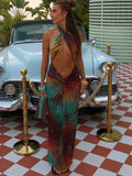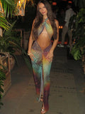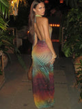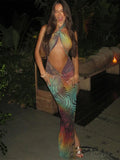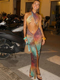 Panelled Halter Cross Women Maxi Dress Sexy Mesh Thin Hollow Pleated Split Sleeveless Sheath Robe Mujer Trend Party Frock