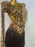 A couture, made‑to‑measure Latin stage costume for adult women that combines a slim, body‑contouring silhouette, bold leopard print panels, and a dramatic black thick‑tassel skirt. Designed for Samba and Tango performance: maximum stage read, secure fit, freedom of movement, and professional finishing.