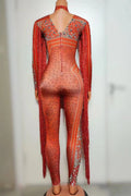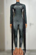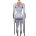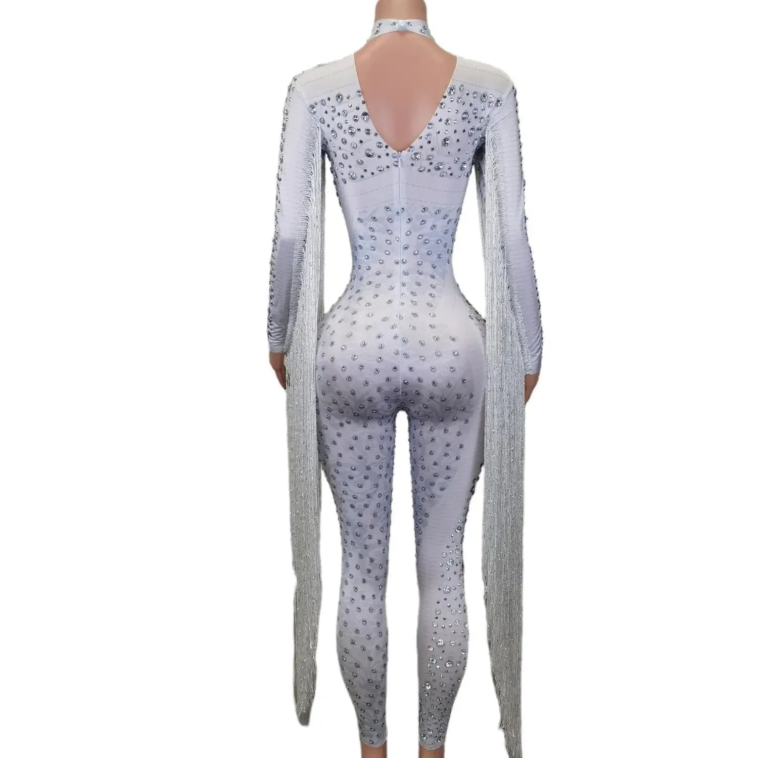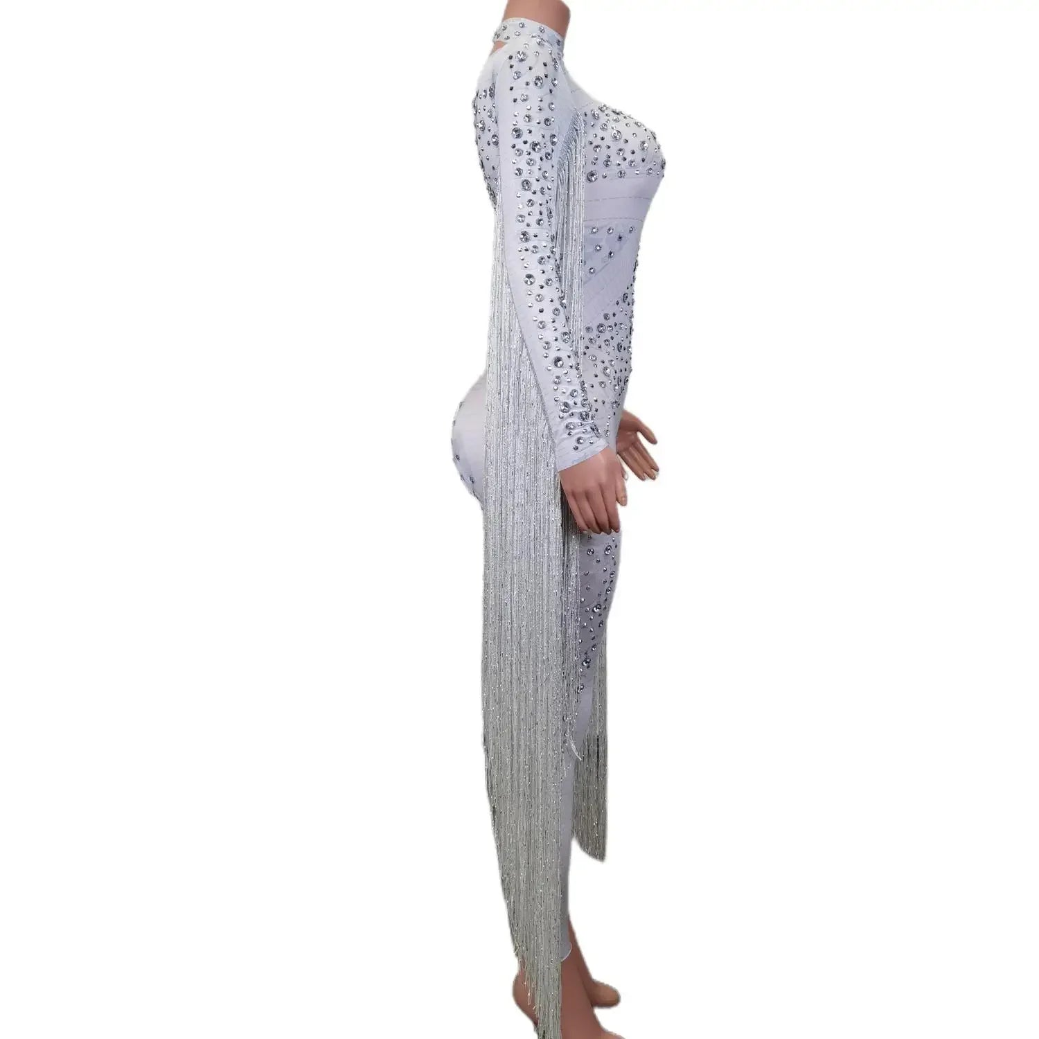 Mono de manga larga con borlas y disfraces de actuación para mujer, mono de una pieza con lentejuelas y diamantes de imitación brillantes, mono blanco para mujer