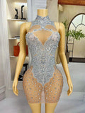 Rhinestones Sleeveless Party Dress Elegant Women Sexy Mesh Stretch Evening Prom Gowns See Through Birthday Costume
