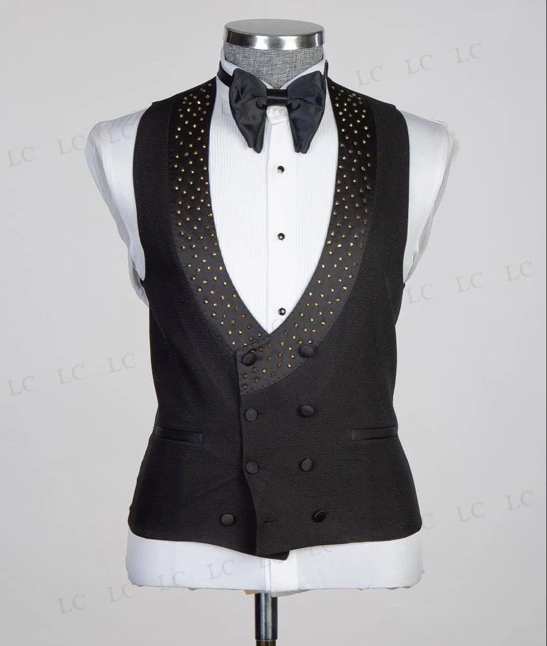 Experimente una elegancia inigualable con nuestro lujoso traje de 3 piezas para hombre, diseñado para el caballero moderno. Este elegante conjunto de esmoquin incluye un blazer meticulosamente confeccionado, un elegante chaleco y pantalones a juego, todos adornados con exquisitos detalles de diamantes que realzan su look formal. Perfecto para bodas, graduaciones y otras ocasiones especiales, este traje combina sofisticación con un toque contemporáneo. Disponible en tallas grandes y personalizable para un ajuste perfecto, le garantiza una impresión imborrable en su día especial.