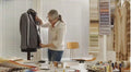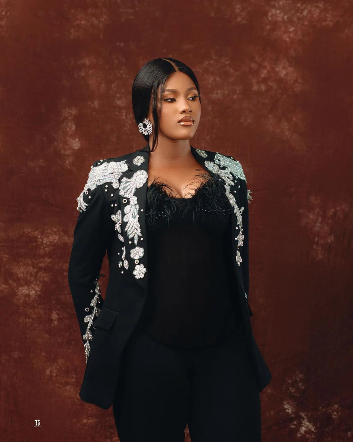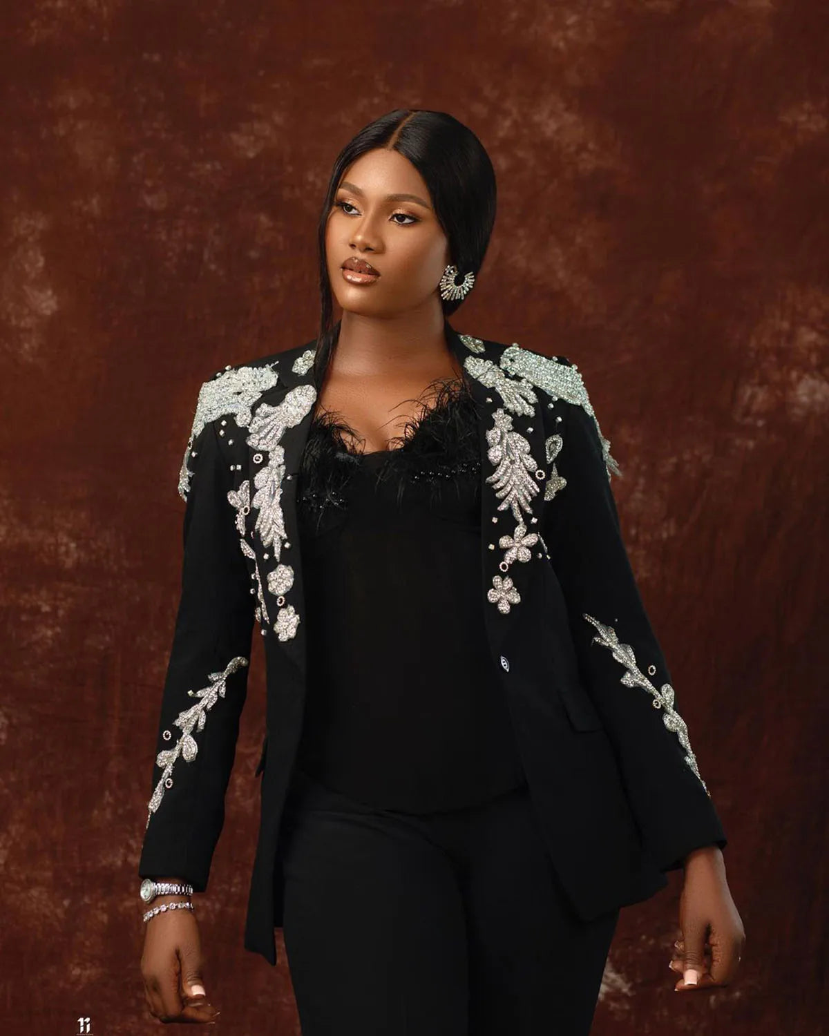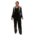 Elegante conjunto de blazer y pantalón de talla grande con cuentas de cristal negro y solapa de pico para un uso diario elegante.