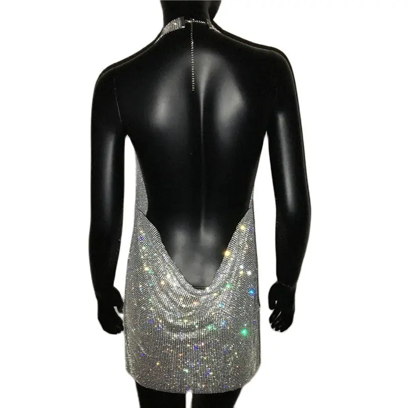 Turn heads at any event with our Luxury Crystal Rhinestone Sequins Mini Dress. This dazzling halter dress is adorned with sparkling rhinestones and sequins, featuring a sultry backless design and a chic side slit. Crafted from shimmering metal mesh, it captures the light beautifully and hugs your curves for a show-stopping silhouette. Perfect for cocktail parties, evening events, or any occasion where you want to make a glamorous statement.