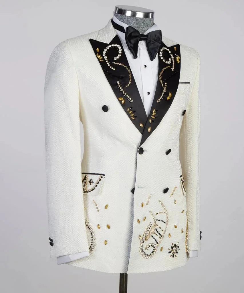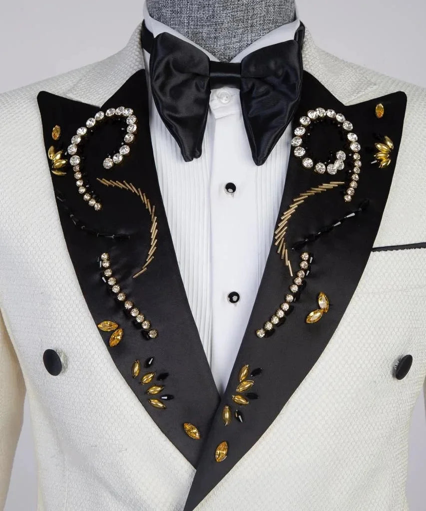 Make an unforgettable entrance with this Luxury Men’s Peaked Lapel Rhinestone Jacket — a single, tailor-made statement coat engineered for grooms, VIP events, red carpets, and any occasion where refined tailoring meets high-glamour detailing. This bespoke double-breasted blazer features a bold peaked lapel and artisan-applied rhinestone and bead embellishments that transform classic menswear into couture-ready outerwear.