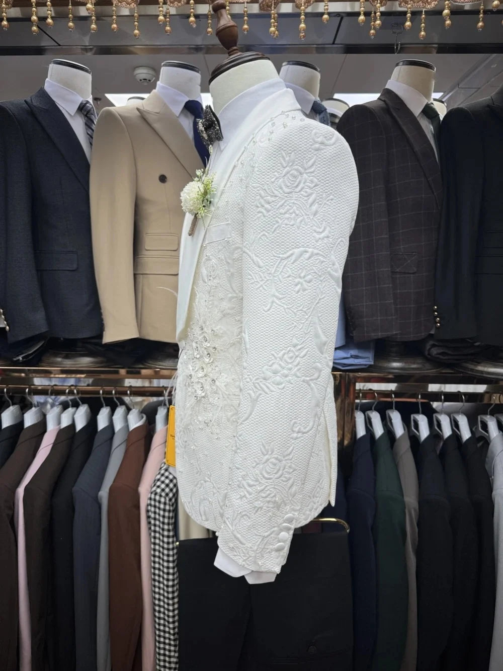 Luxury Men's Suit Shawl Lapel Appliques Tailor-Made 3 Pieces Set Jacket Pearls Jacquard One Button Customized Coat Vest Pants