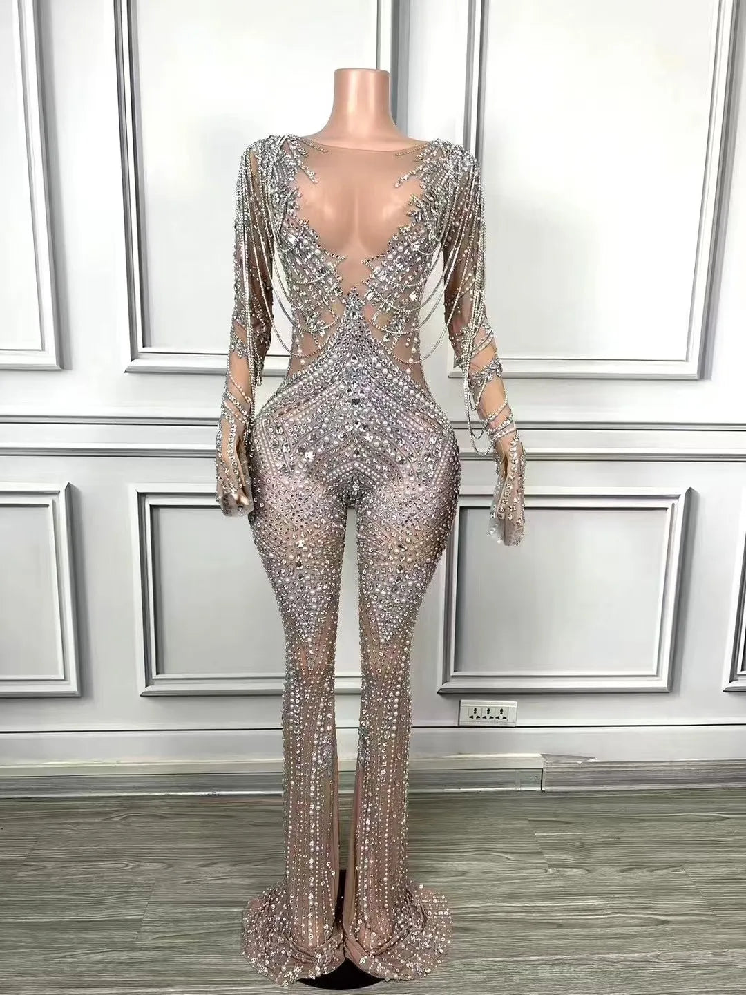 Strike a balance between couture glamour and stage-ready functionality with this Luxury Rhinestones Chain Sheath Jumpsuit — a sculpting, high-impact piece designed for singers, dancers, hosts, and nightlife performers who want to sparkle, move freely, and photograph brilliantly.