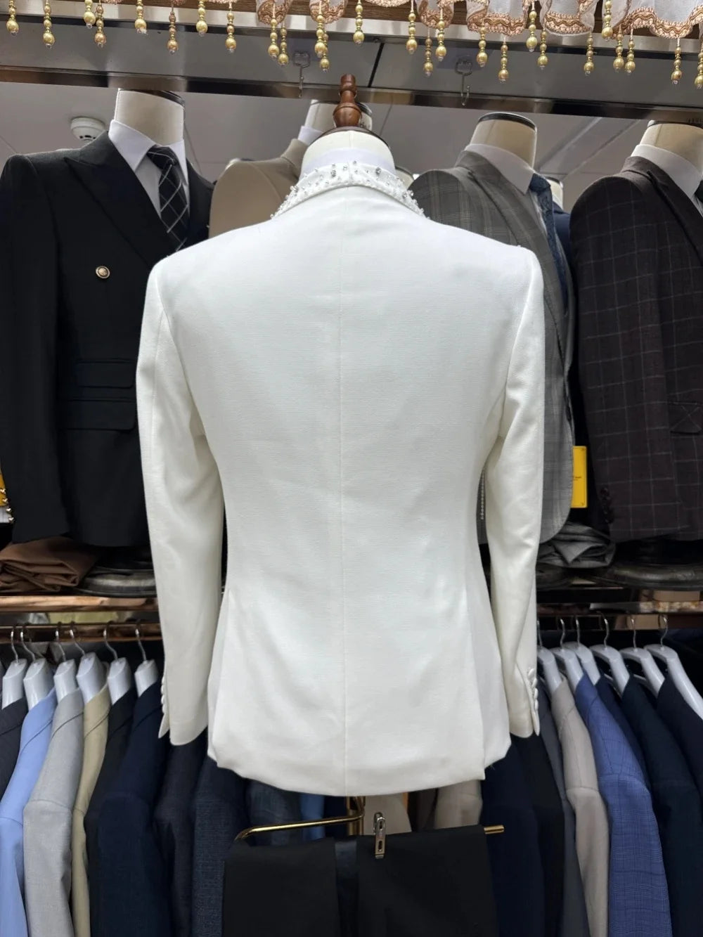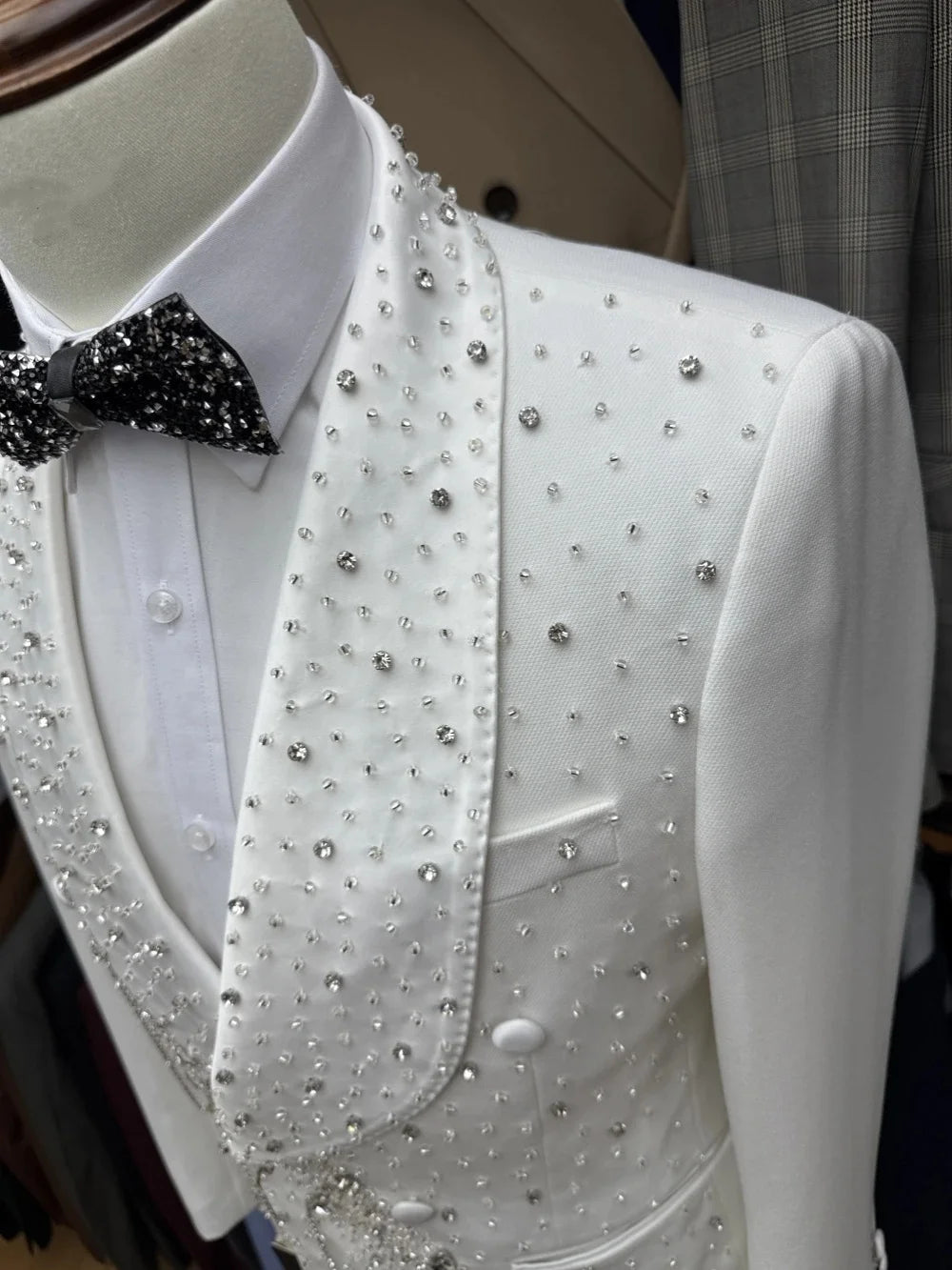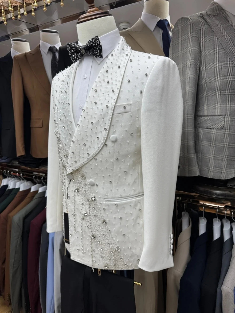 Turn heads with this luxurious, tailor‑made 2‑piece suit designed for grooms, red‑carpet moments, stage performances, and any occasion that calls for glamour. This double‑breasted blazer features a beaded, rhinestone‑encrusted shawl lapel and elegant tassel detail — all customizable to your exact measurements and style preferences.