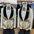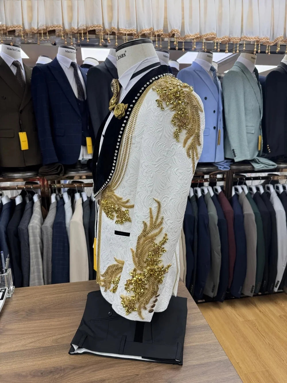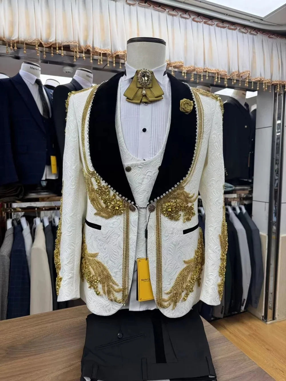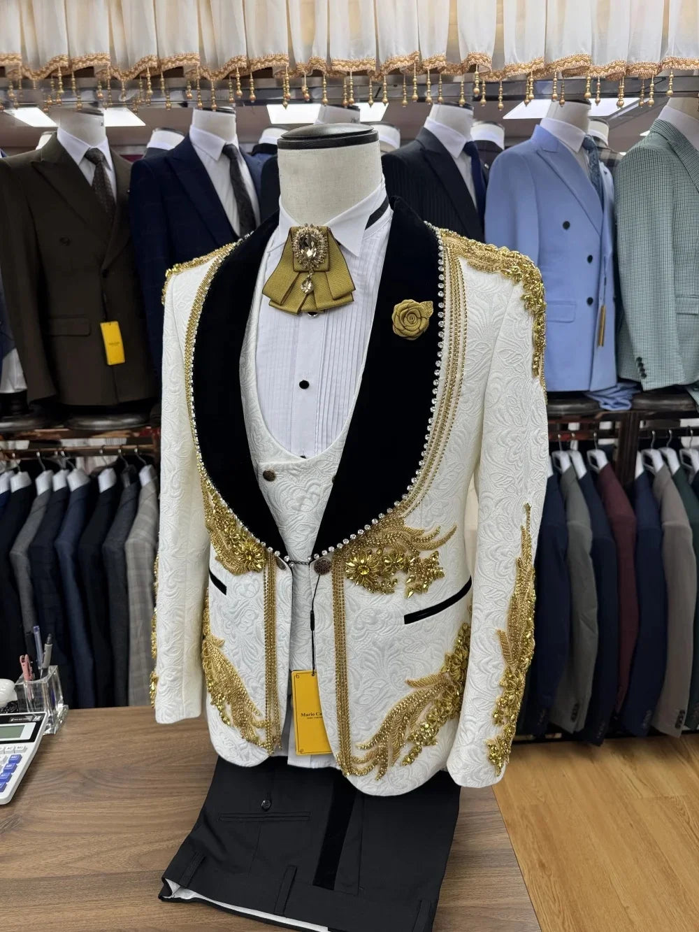 Men Suits Tailor-Made 3 Pieces Set Coat Jacquard Appliques Tassel Shawl Lapel Crystal Blazer Customized Jacket Vest Black Pants