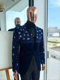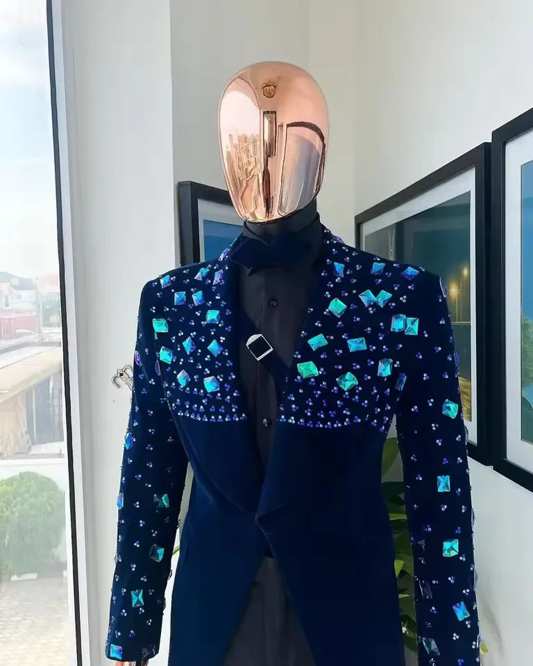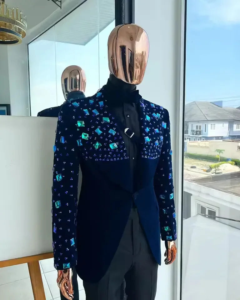 Stand out with refined luxury in this tailor‑made 2‑piece suit featuring a velvet one‑button blazer with a unique shawl lapel embellished with crystal beading. Perfect for weddings, prom, red‑carpet events, and formal evenings, this custom set pairs couture embellishment with precise tailoring for a flattering, high‑impact look.