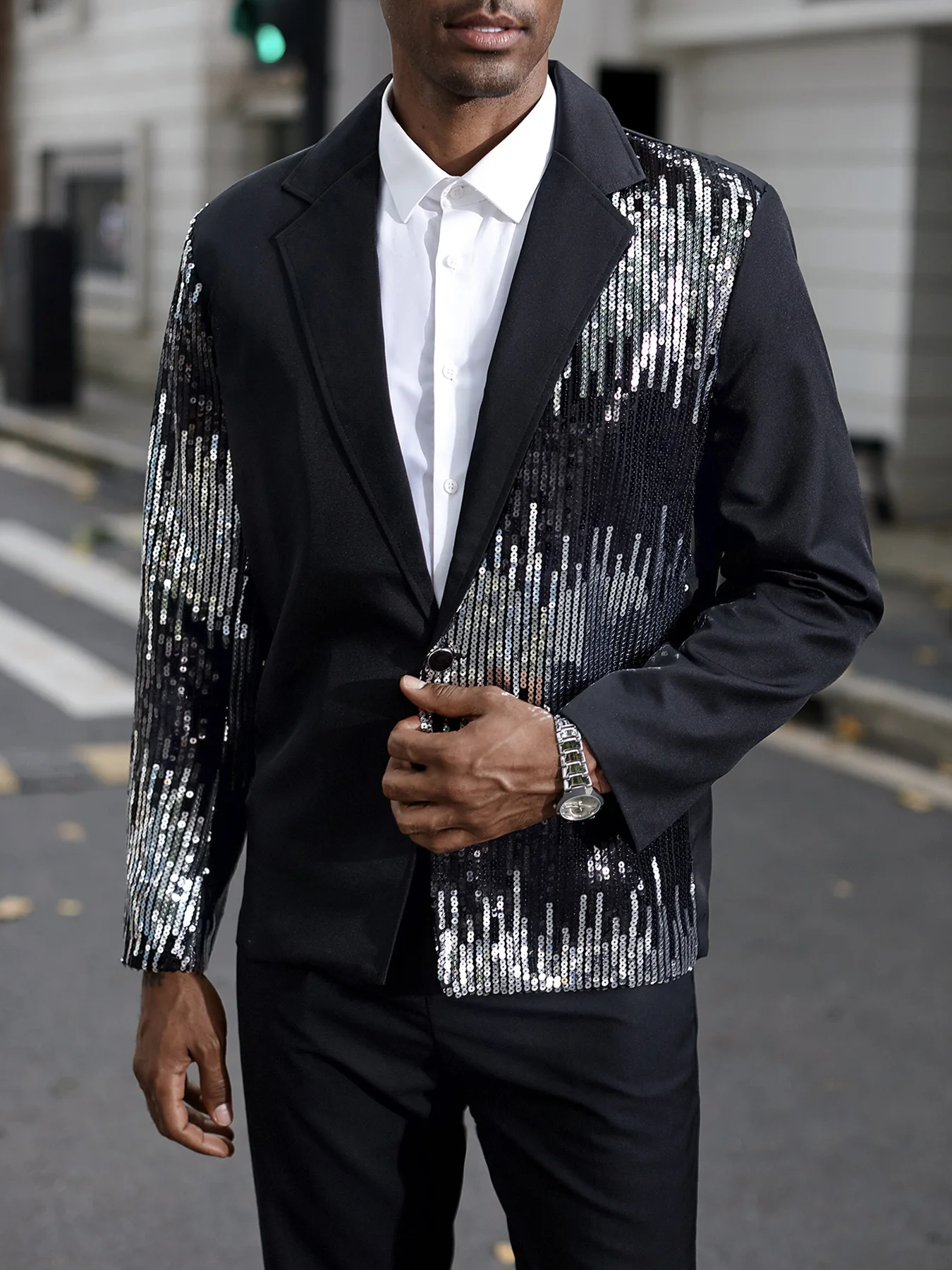 Luce un estilo único con esta chaqueta de traje para hombre, con un diseño circular único de brillo. Combinando a la perfección un estilo casual con un toque llamativo, esta chaqueta realza cualquier ocasión, desde bodas y cenas hasta espectáculos callejeros y celebraciones navideñas. Confeccionada para la comodidad y un atractivo llamativo, es ideal para quienes buscan añadir un toque de brillo a su vestuario. Ya sea para un evento especial o buscando el regalo perfecto para estas fiestas, esta chaqueta de traje brillante es tu opción ideal para un estilo moderno e inolvidable.