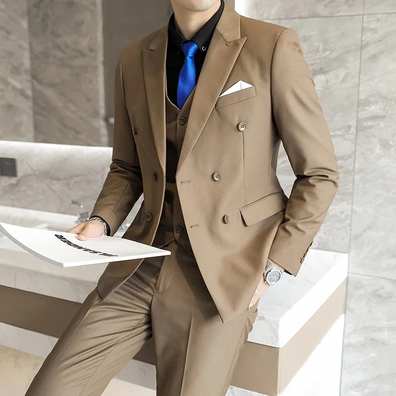 Traje de hombre color canela con blazer cruzado y pantalón, con corbata azul
