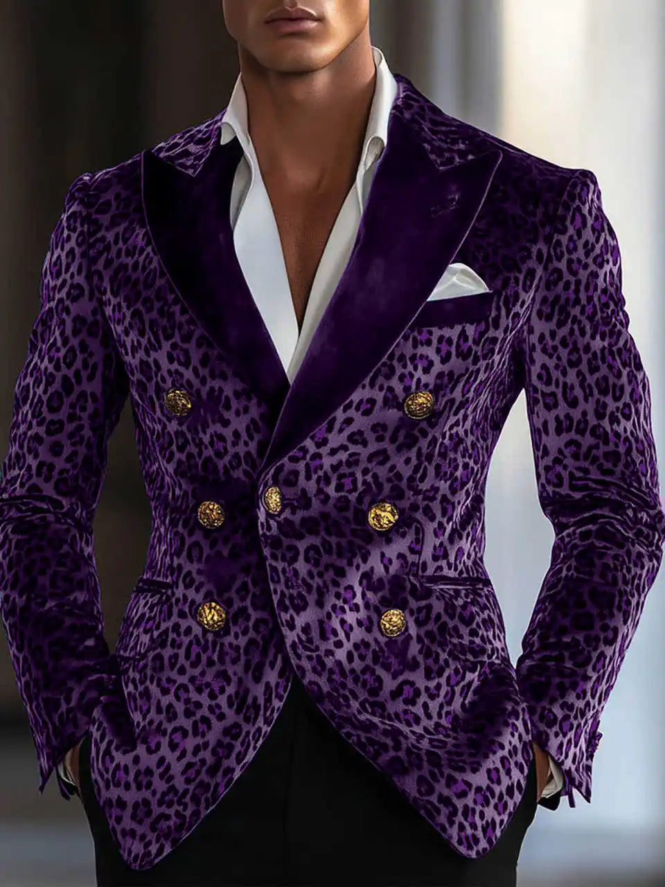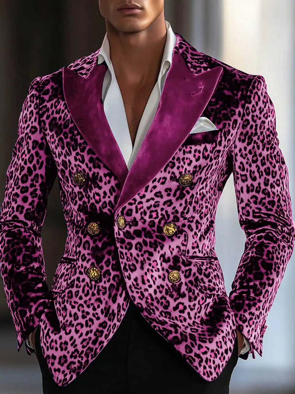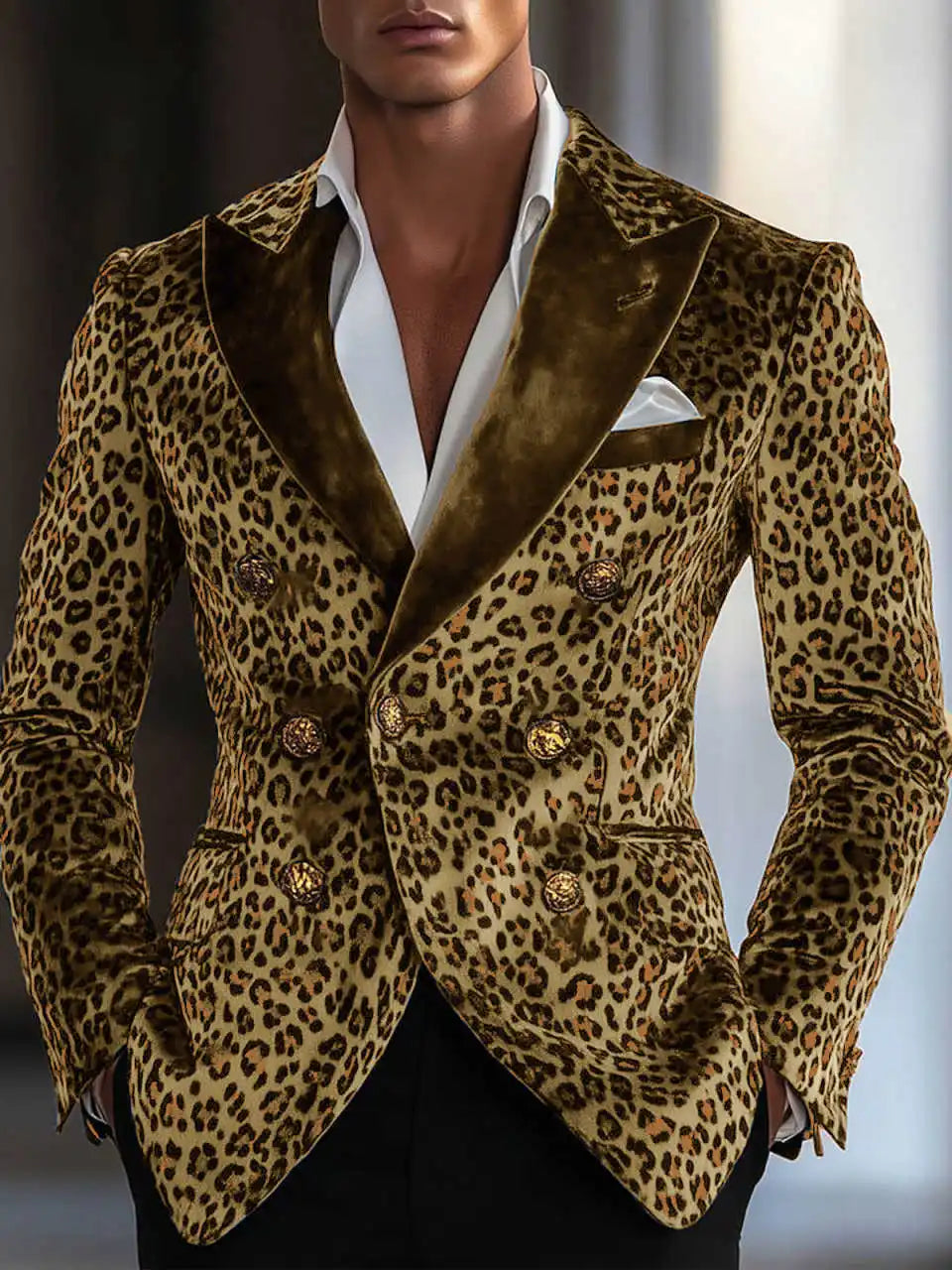 A bold, fashion-forward single-item blazer that blends contemporary tailoring with statement animal-print styling. This Modern Leopard-Print Double‑Breasted Jacket is designed for grooms, performers, and style-conscious men who want to stand out at weddings, parties, and upscale events while keeping the proportions and fit of classic formalwear.