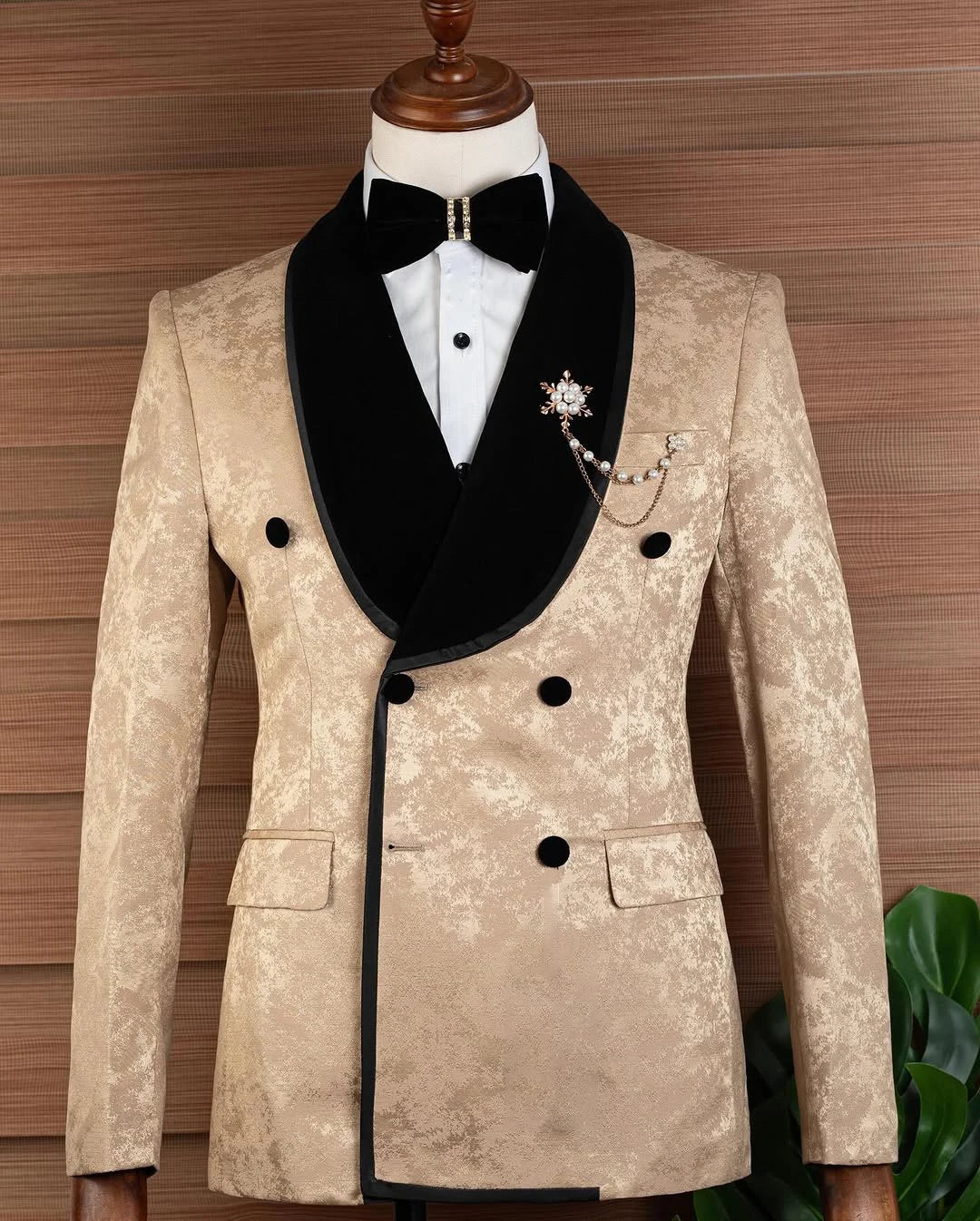 Create a striking, modern groom or formal look with this tailor‑made 2‑piece velvet suit, featuring jacquard texture and a refined shawl lapel double‑breasted jacket. Designed for weddings, proms, and upscale events, this customized set blends luxurious materials with precise tailoring for a memorable silhouette.