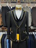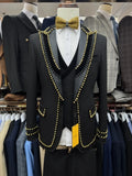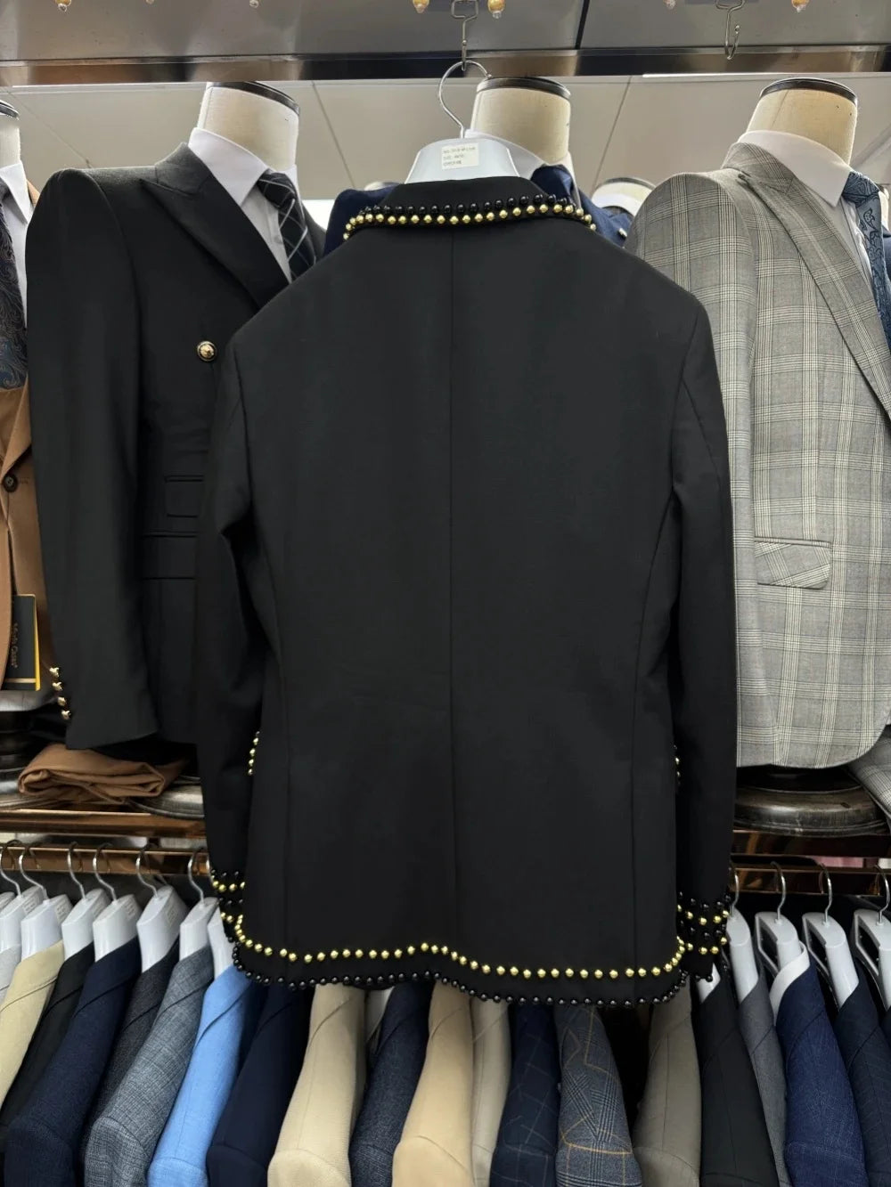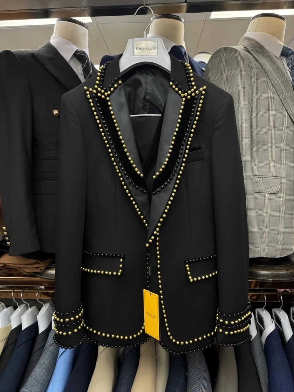 Capture vintage flair with modern tailoring in this Retro Men Suits two‑piece set. Tailor‑made to your measurements, the ensemble pairs a peaked‑lapel jacquard jacket adorned with rhinestone accents and a one‑button closure with matching tailored pants — a striking choice for grooms, formal events, or fashion‑forward occasions.