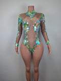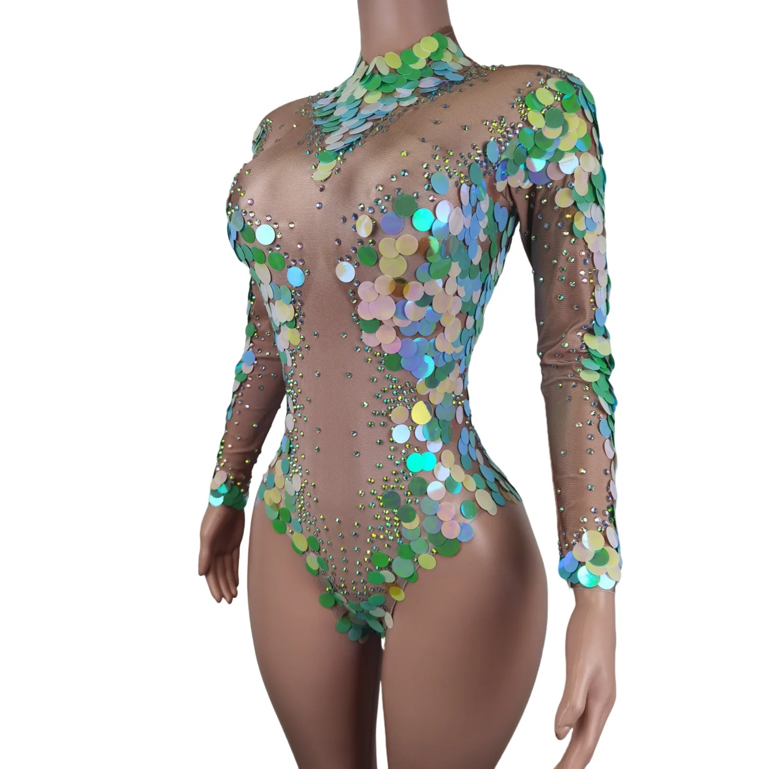 Mono de lentejuelas multicolor para mujer, ropa de espectáculo de danza jazz, fiesta, sexy, de malla y con diamantes de imitación, ajustado.
