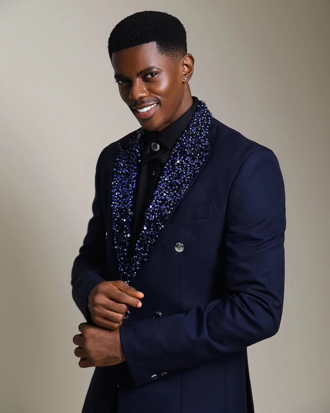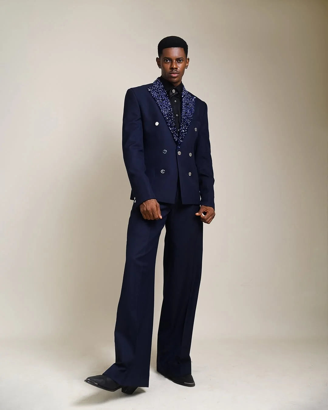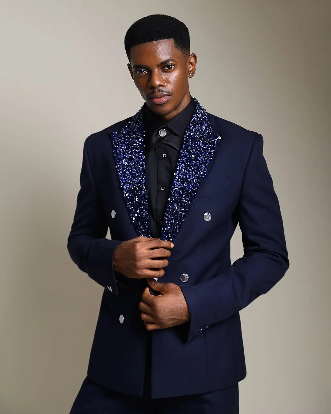Step out in style with this navy blue men’s suit set, featuring a sharp 2-piece combination of a blazer and matching trousers. The beaded lapel detail adds a touch of unique elegance, making it the ideal tuxedo for weddings, proms, formal events, or professional office wear. Expertly crafted with attention to fit and comfort, this customized jacket and pant set ensures you look polished and memorable for every special occasion.